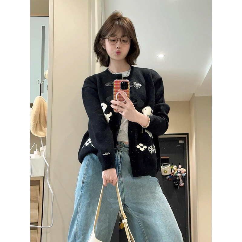复古牛角扣兔子提花毛衣外套女秋冬季加厚设计感宽松圆领针织开衫