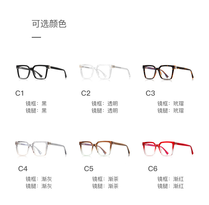 镜框颜色 C1亮黑框,C2亮透明框,C3茶豆花框,C4渐进灰框,C5渐进茶框,C6渐进红框