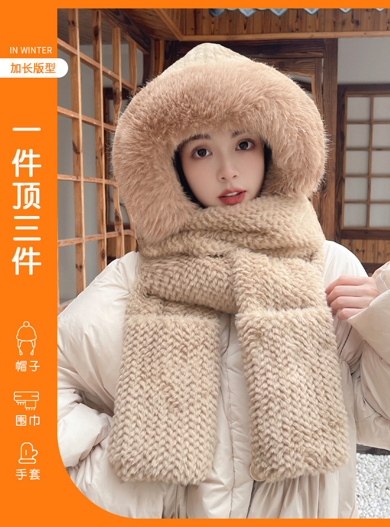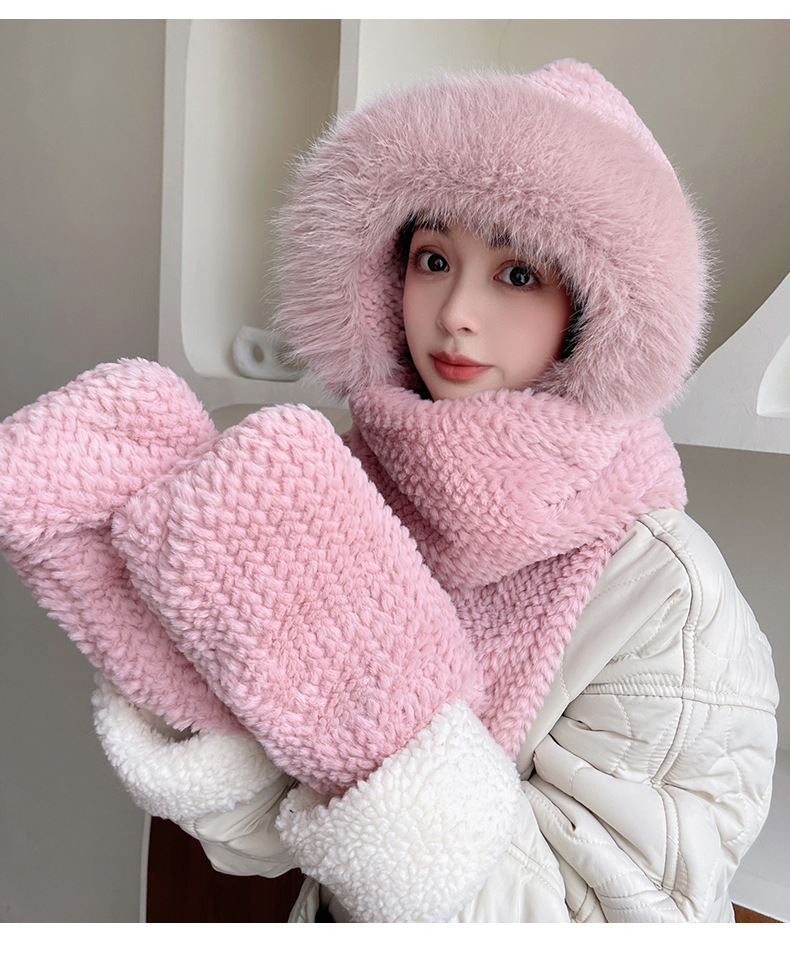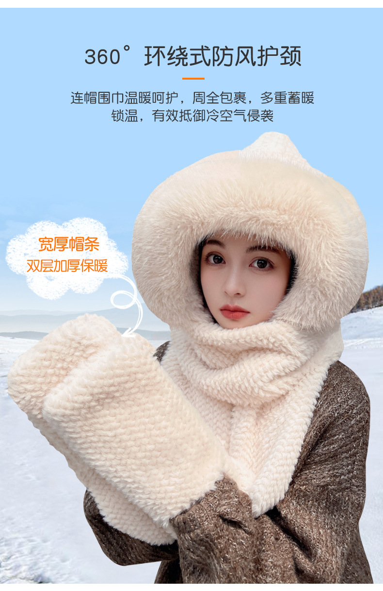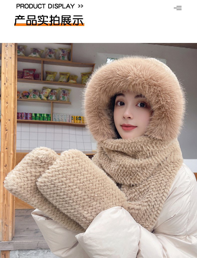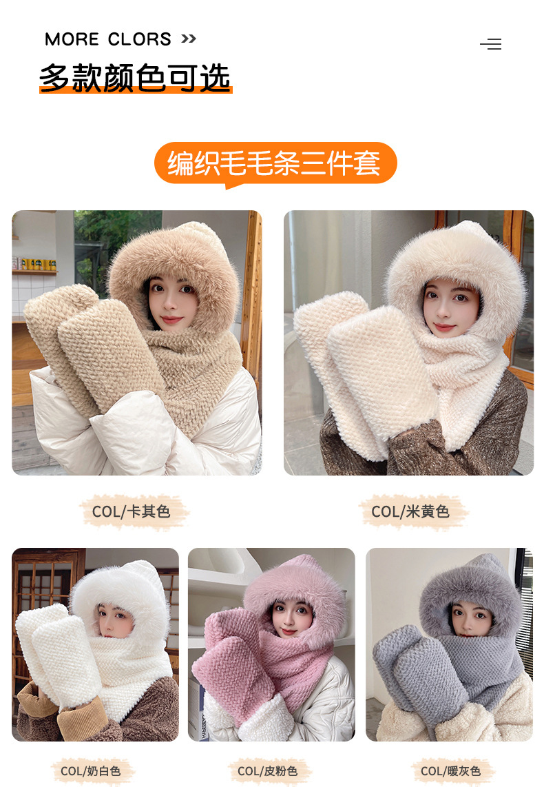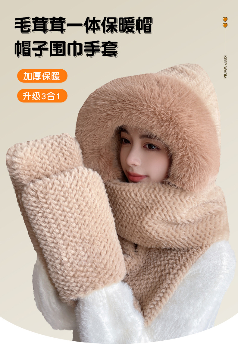 毛绒帽子女冬季加厚围巾手套一体骑车护耳保暖连帽三件套保暖帽