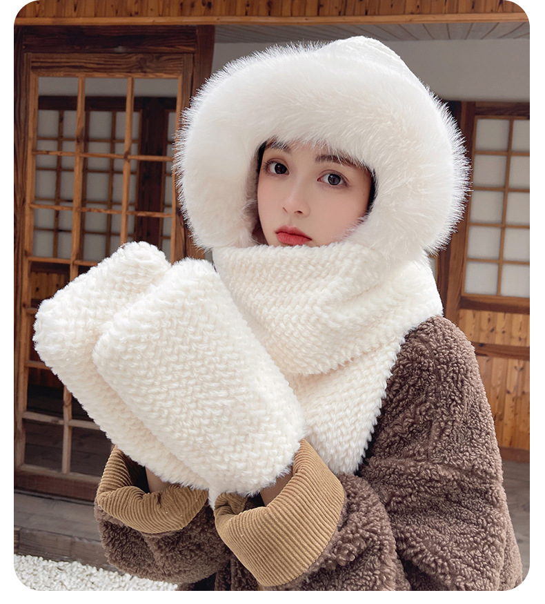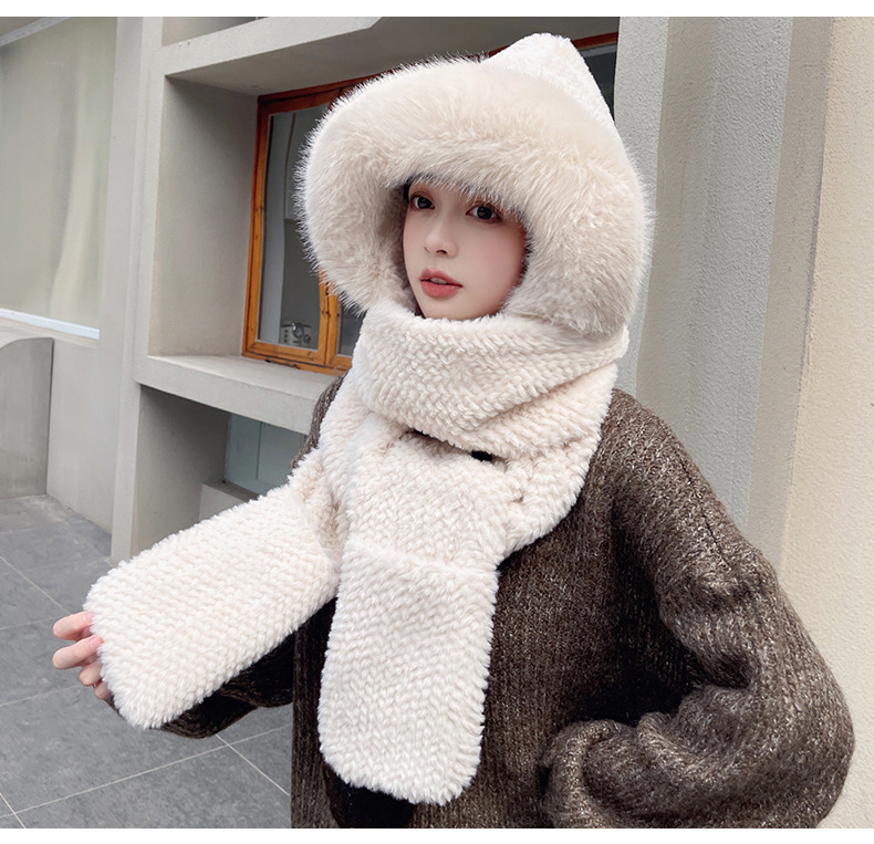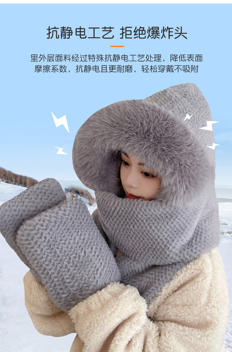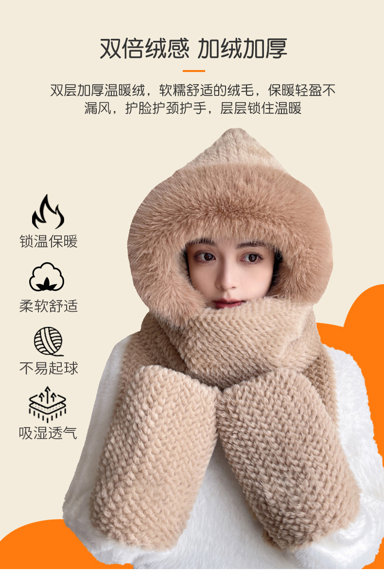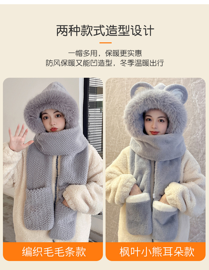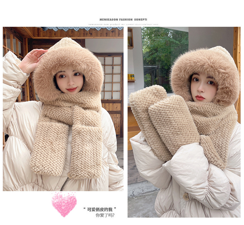 毛绒帽子女冬季加厚围巾手套一体骑车护耳保暖连帽三件套保暖帽