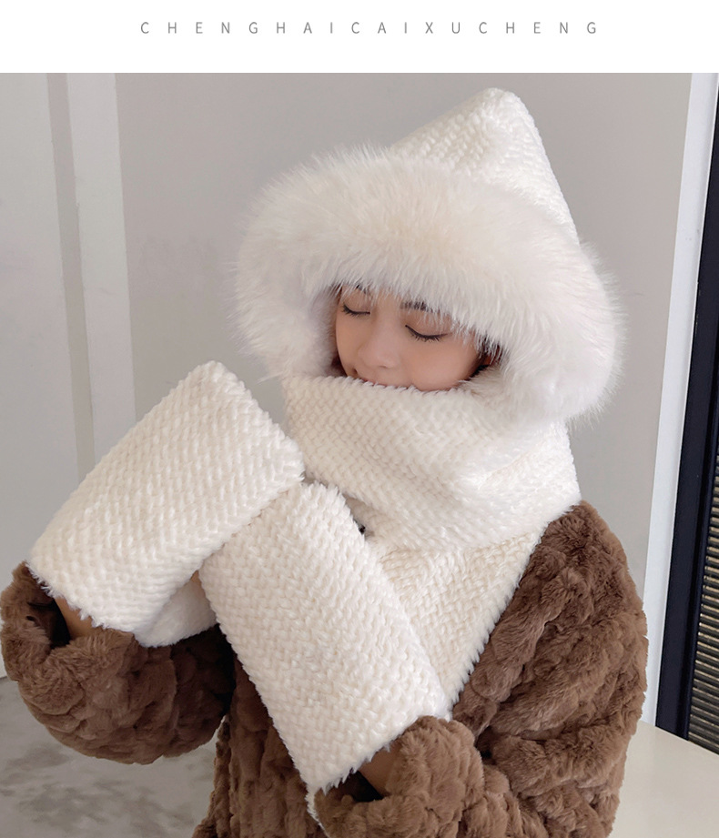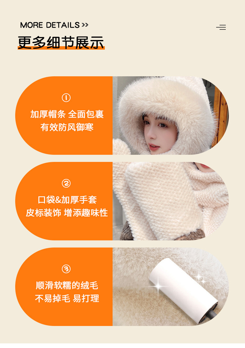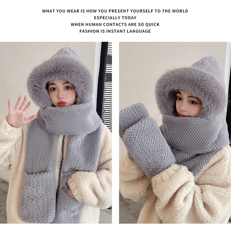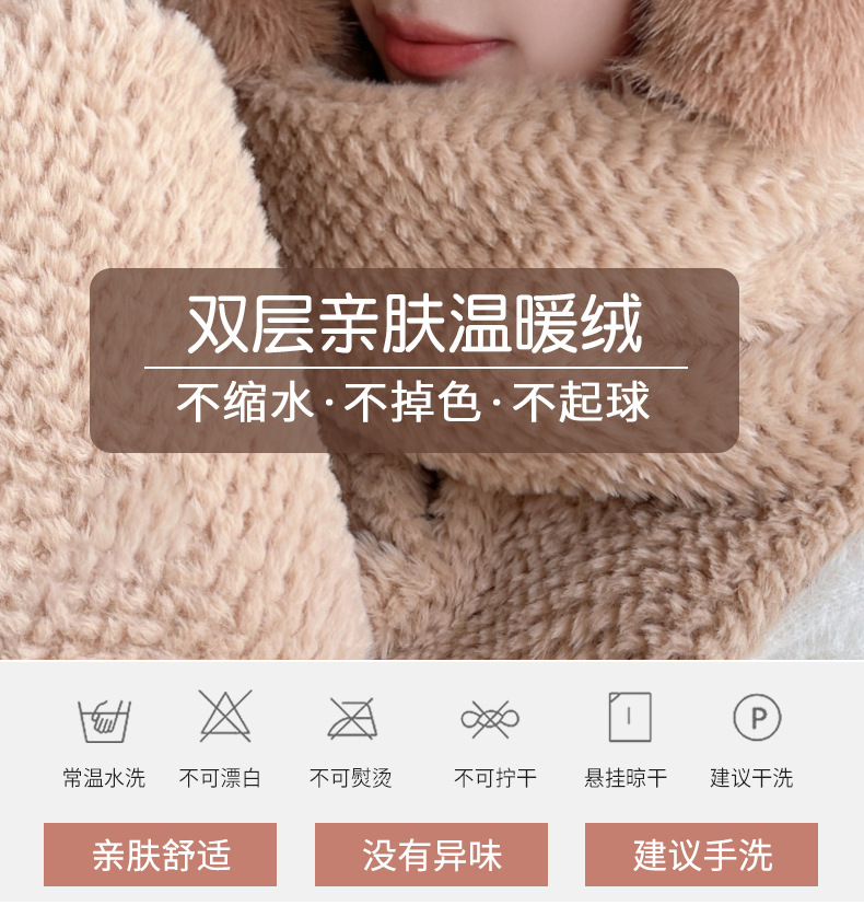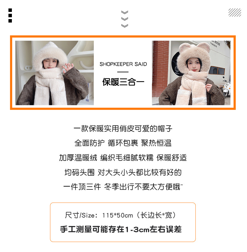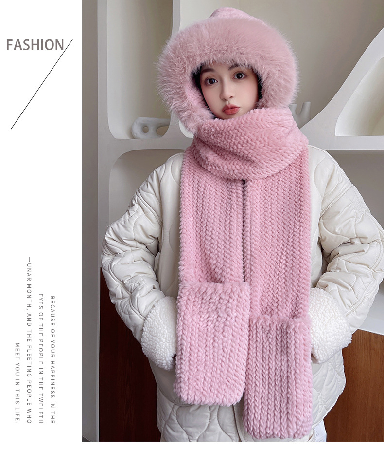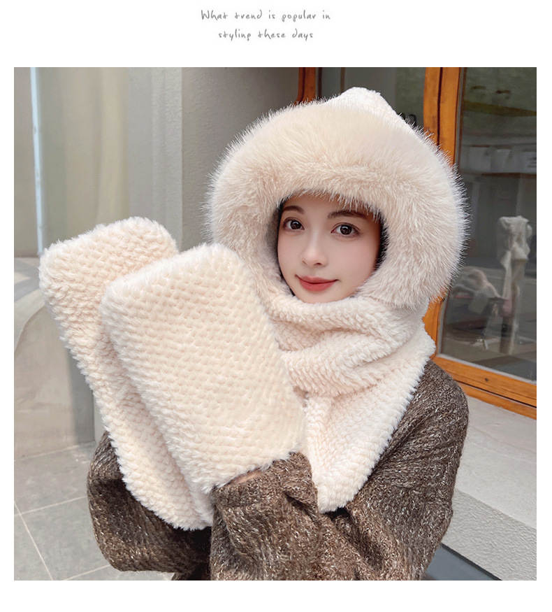 毛绒帽子女冬季加厚围巾手套一体骑车护耳保暖连帽三件套保暖帽