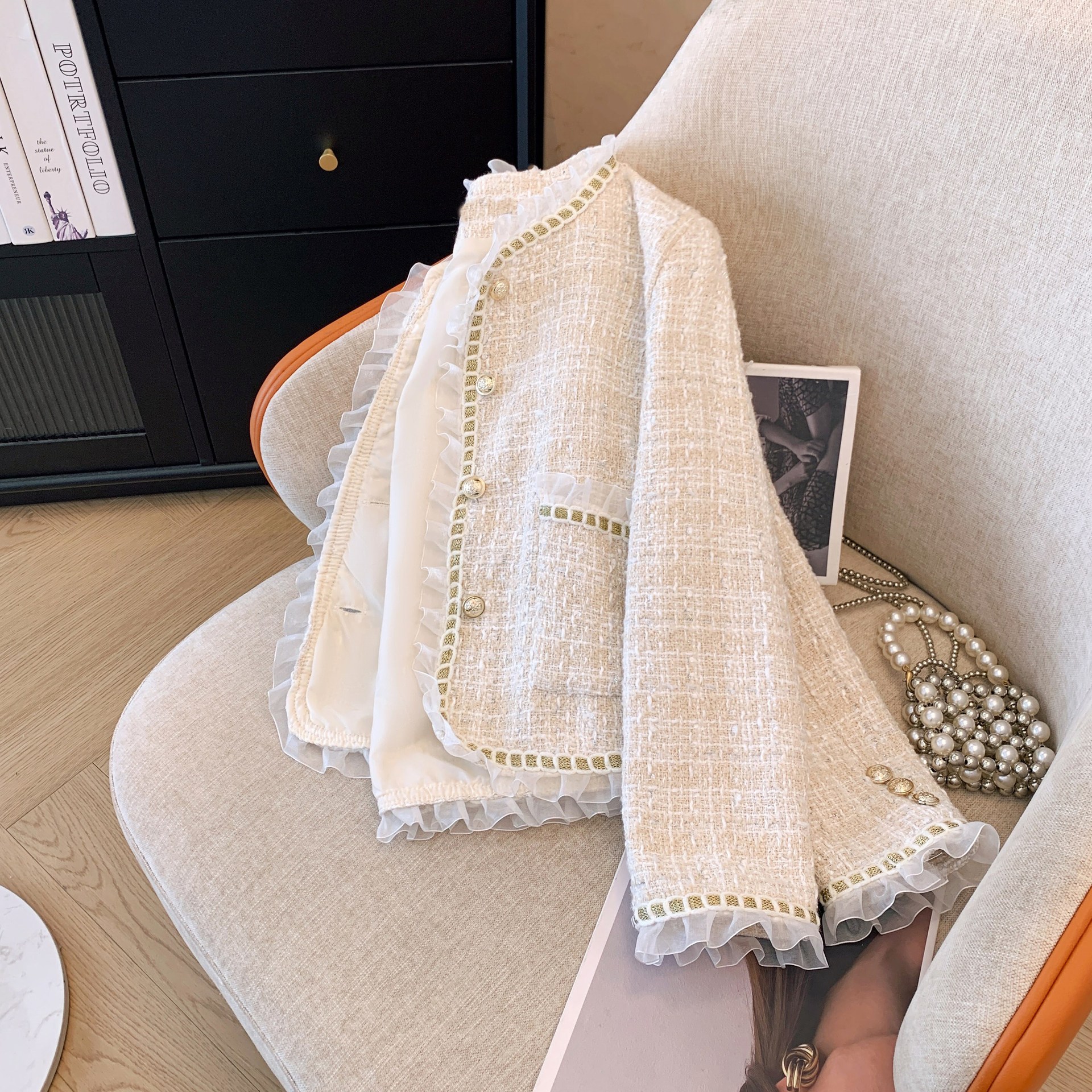 名媛風気質小香風ショートコート女性2025秋春レトロなネット糸が粗い上着をつなぎ合わせている