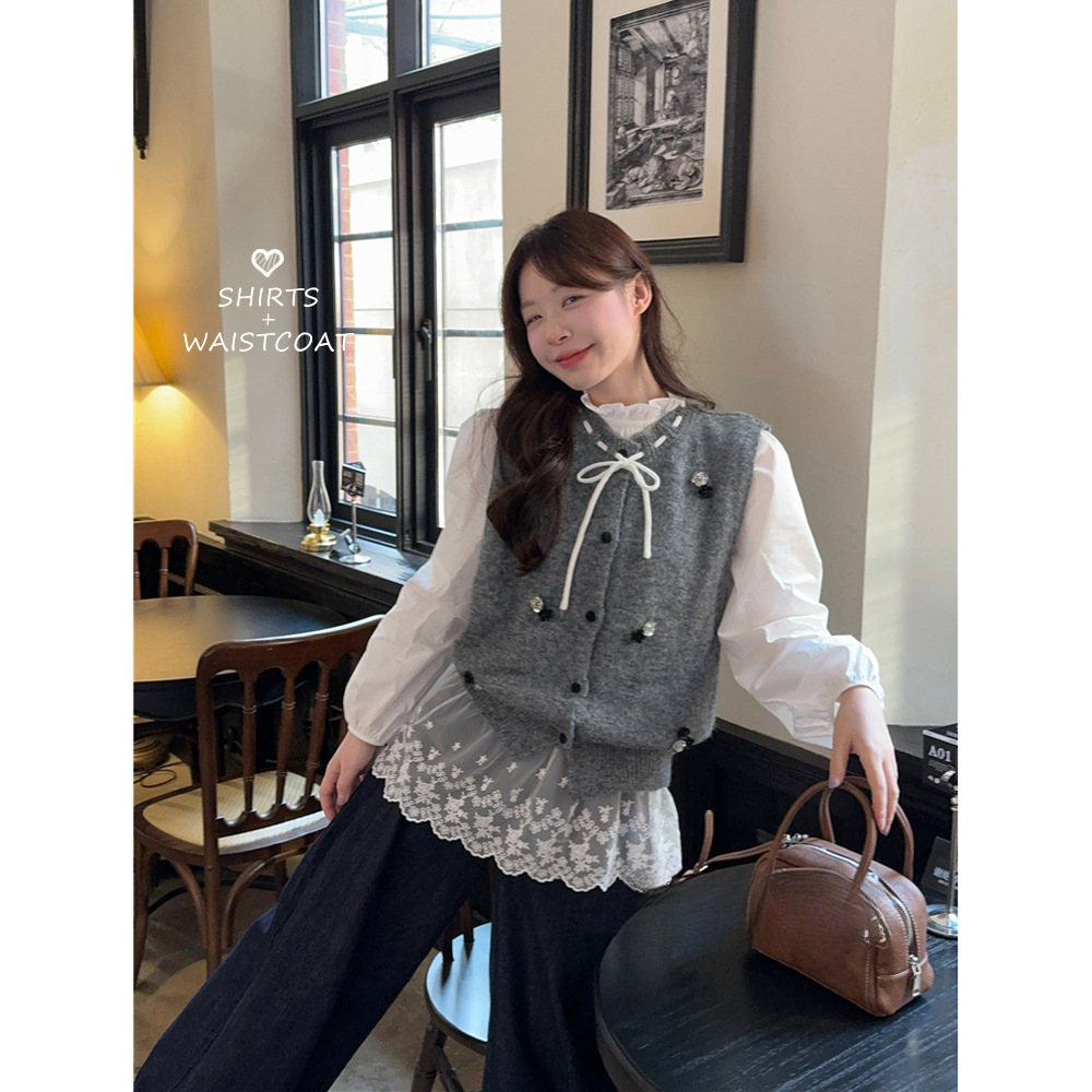小香風減齢帯蝶結びニット馬甲2025春の新型重工はゆったりした上着を重ねて女装する