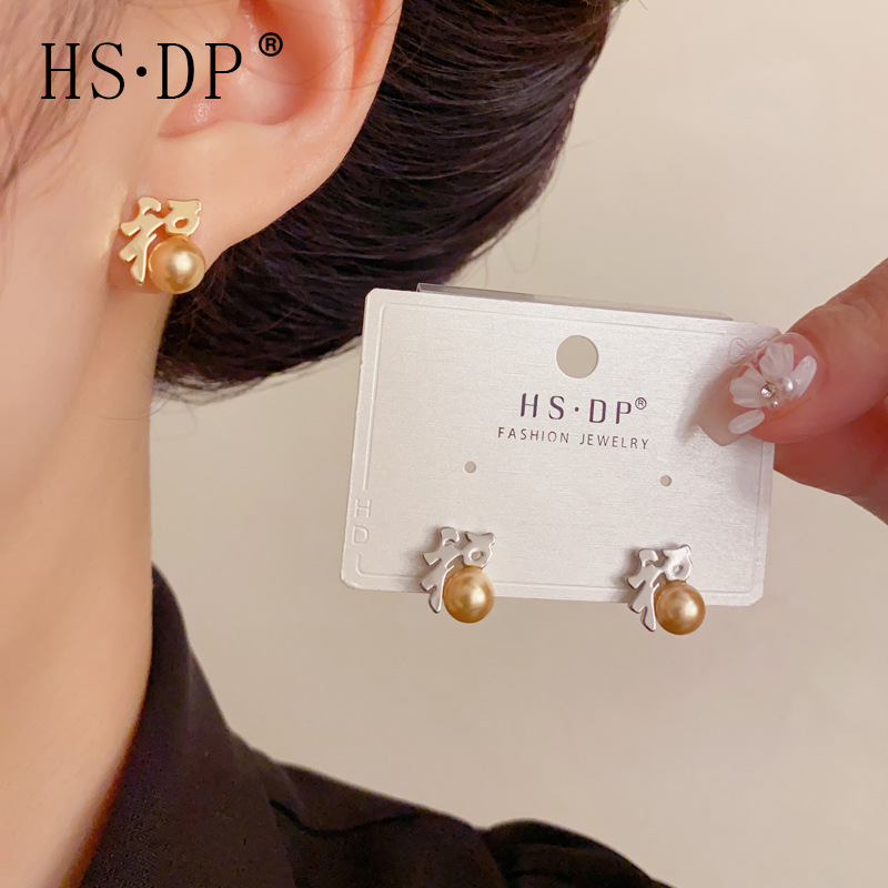 小众时尚简约金属福字珍珠耳钉女气质轻奢百搭小巧设计感耳环批发
