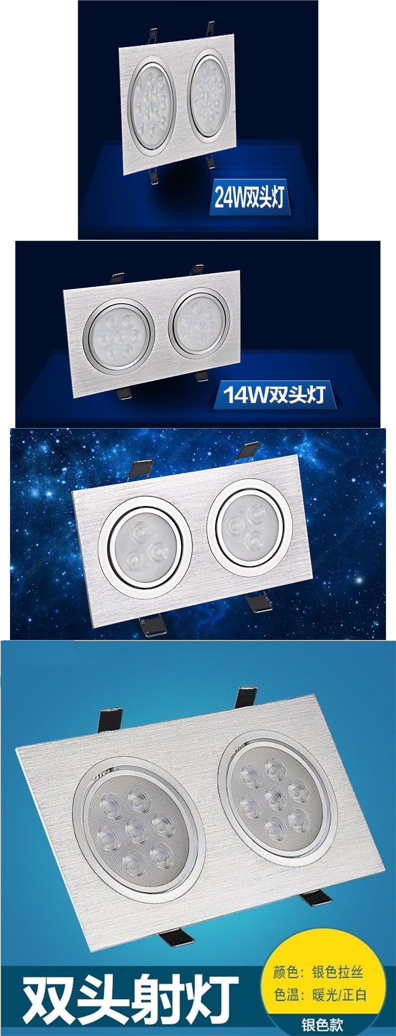 灯光颜色 3w正方形【外径9*9cm】,长方形3w * 2拉丝银,长方形5w * 2白光拉丝银,长方形5w * 2黄光拉丝银,长方形7w * 2白光拉丝银,长方形12w * 2白光拉丝银,长方形18w * 2白光拉丝银,更多光色和规格请联席,5wcob正方形【外径9*9cm】,12wcob正方形【外径9*9cm】,7w正方形【外径12*12cm】,12wcob正方形【外径12*12】,12w正方形【外径14*14cm】,18w正方形【外径16*16cm】