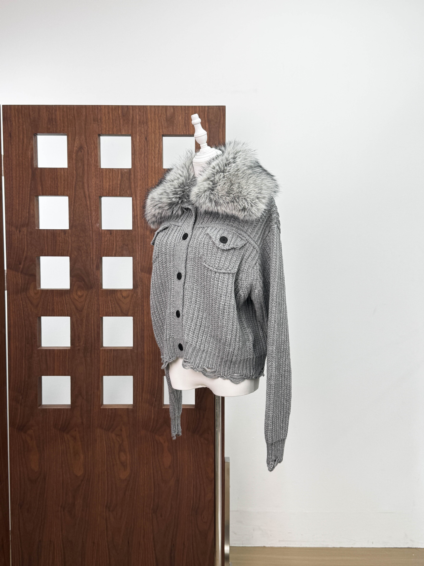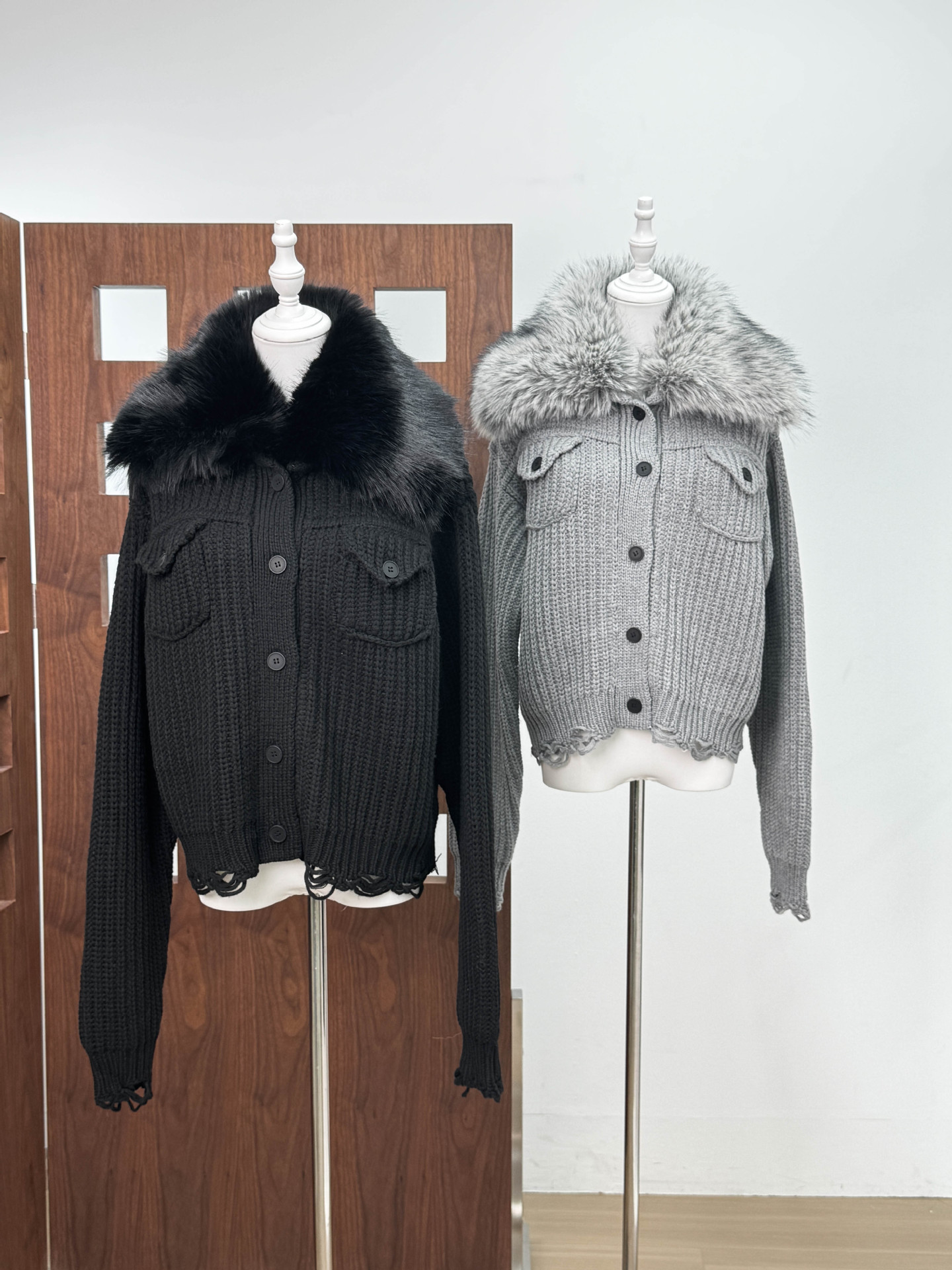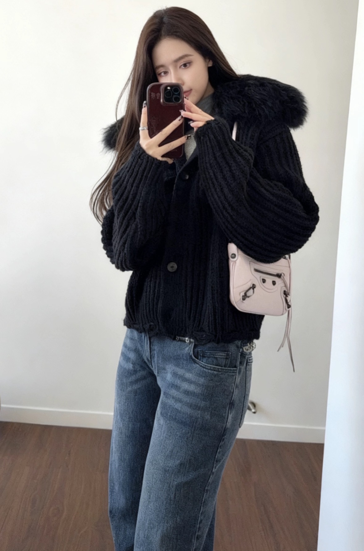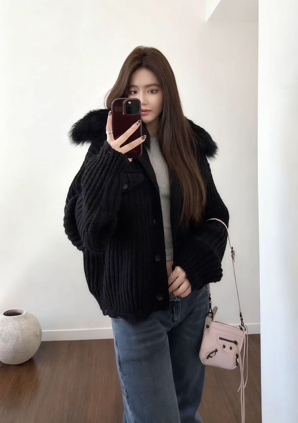 正确版blu~秋冬新款大毛领加厚可拆卸螺纹针织开衫短外套