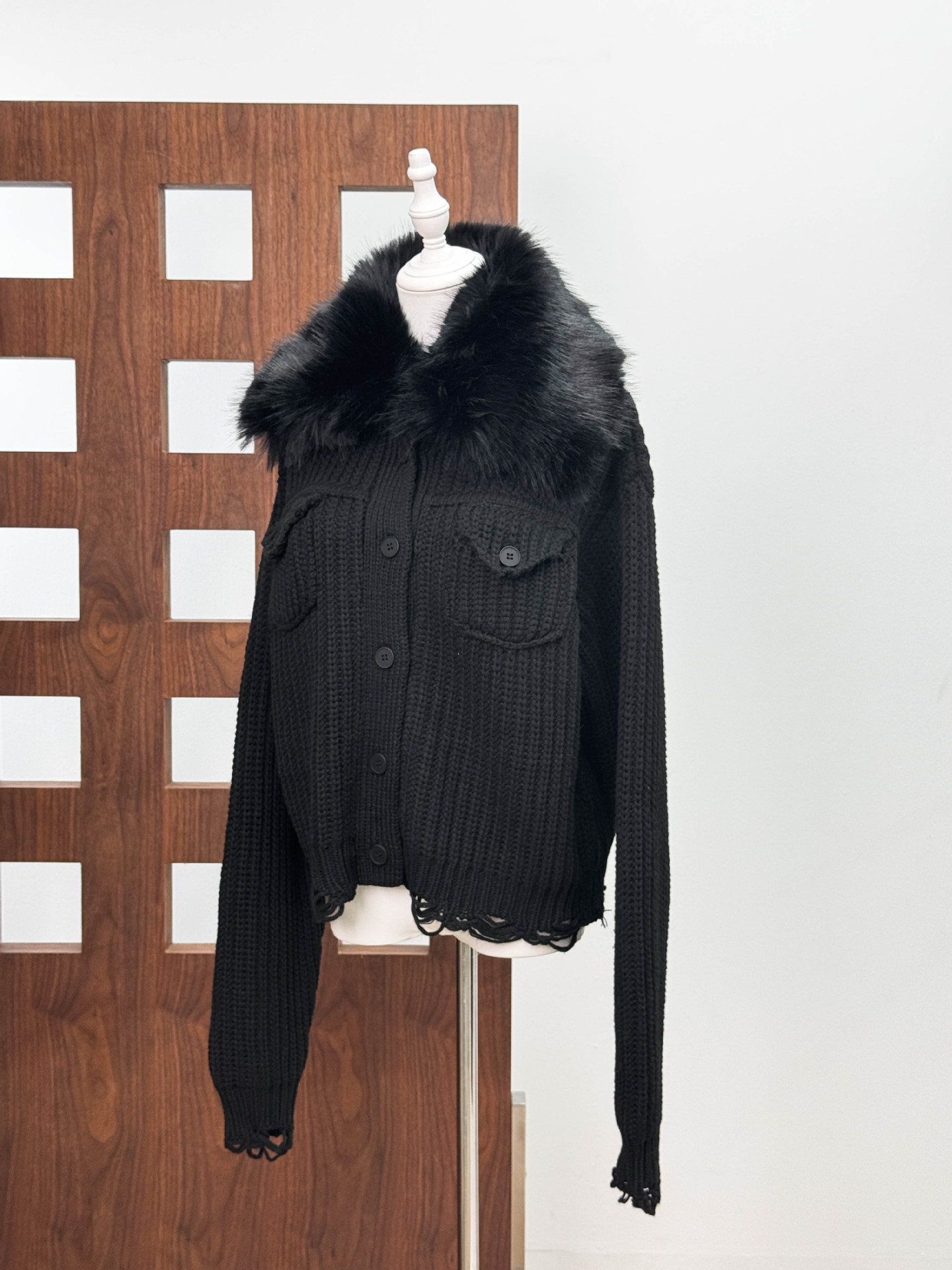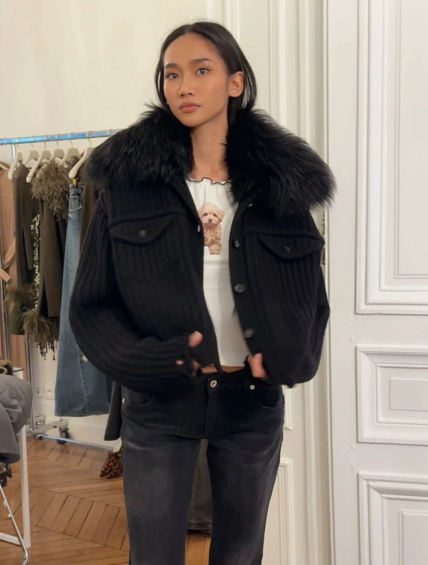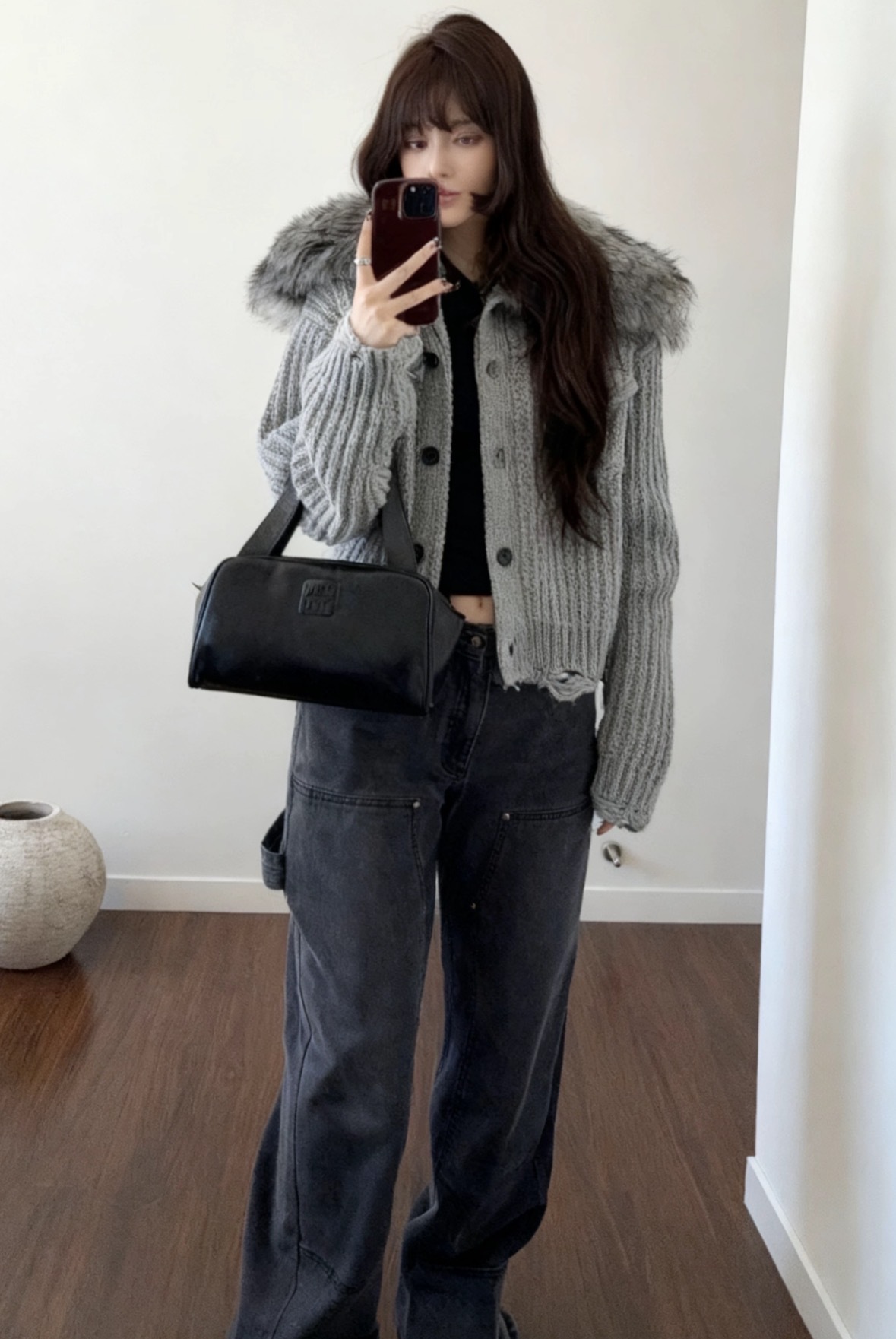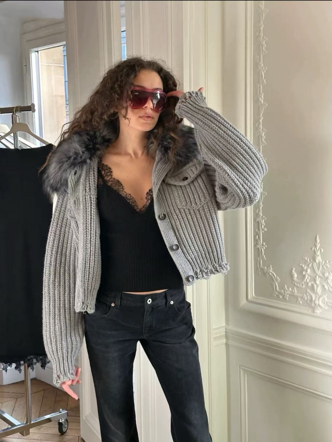 正确版blu~秋冬新款大毛领加厚可拆卸螺纹针织开衫短外套
