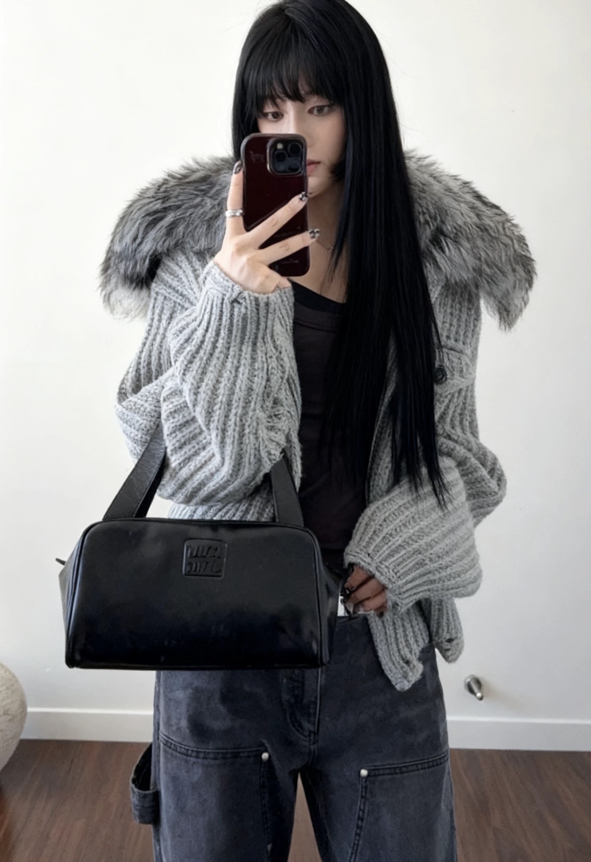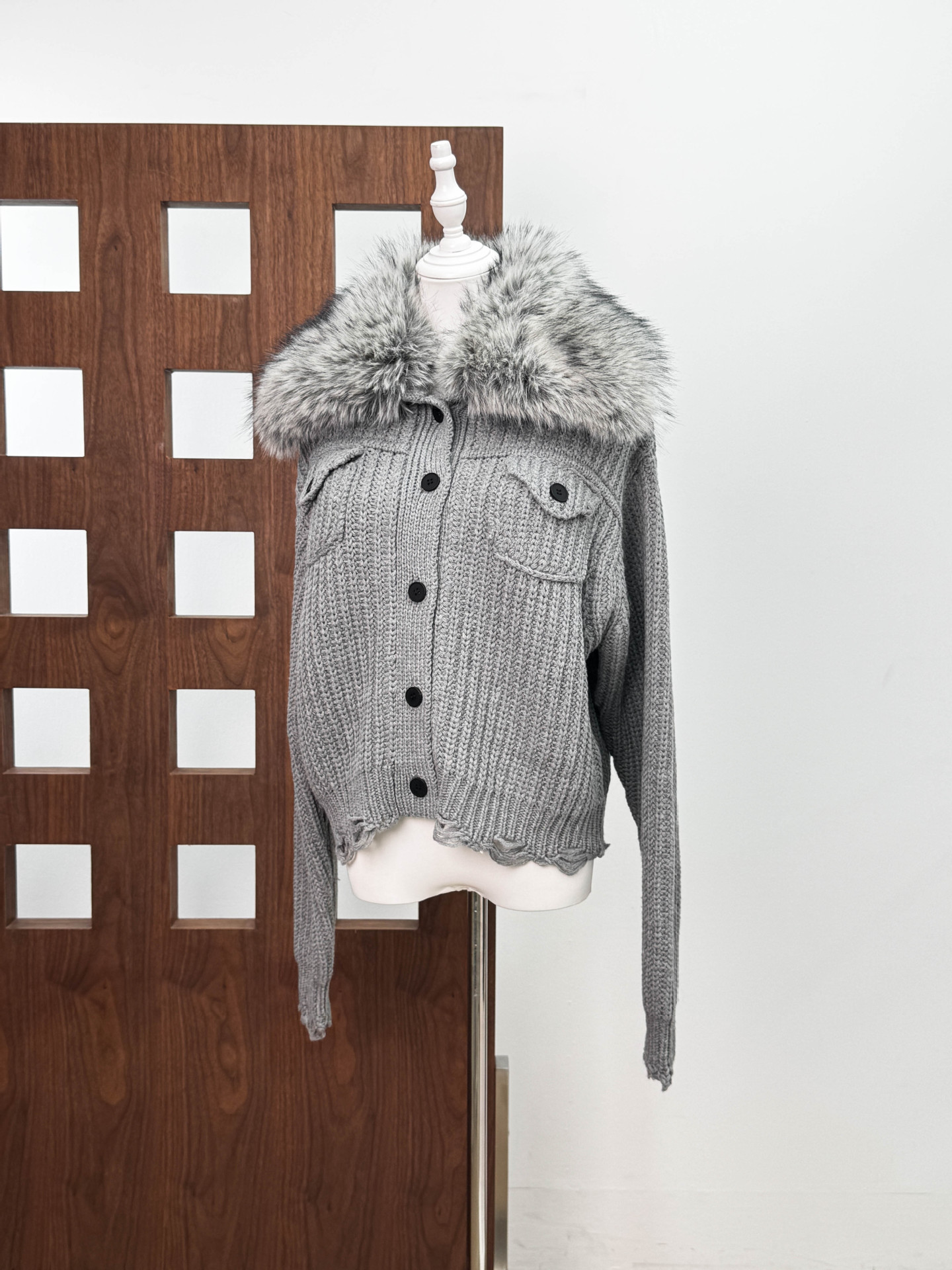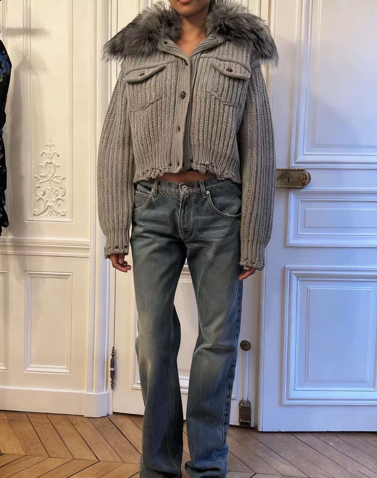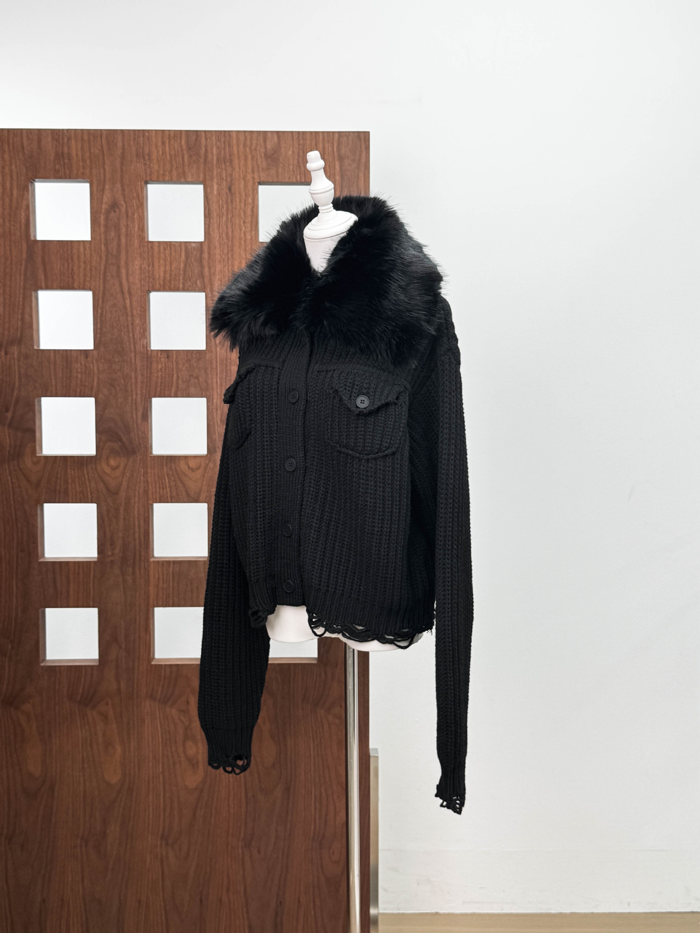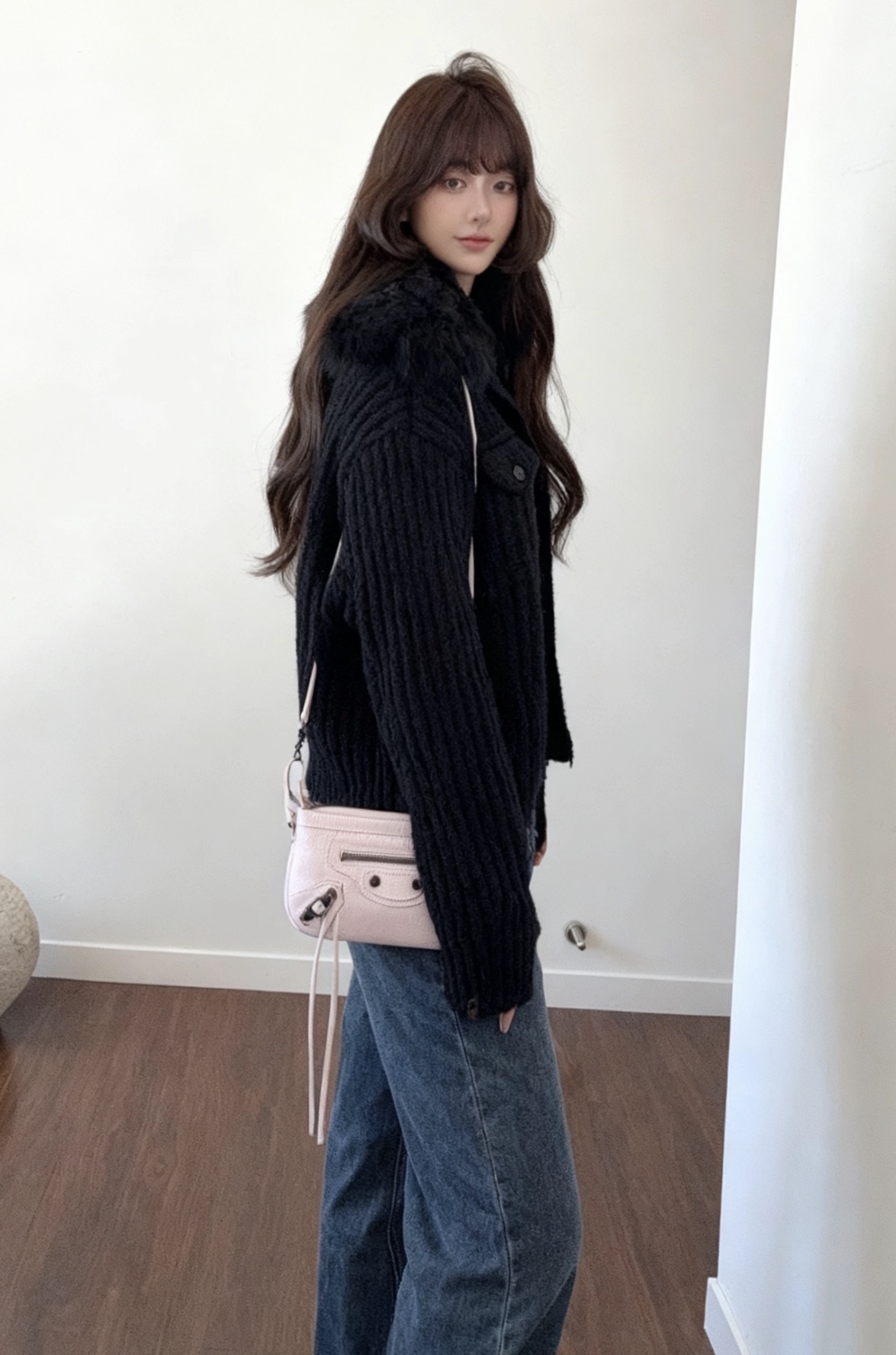 正确版blu~秋冬新款大毛领加厚可拆卸螺纹针织开衫短外套