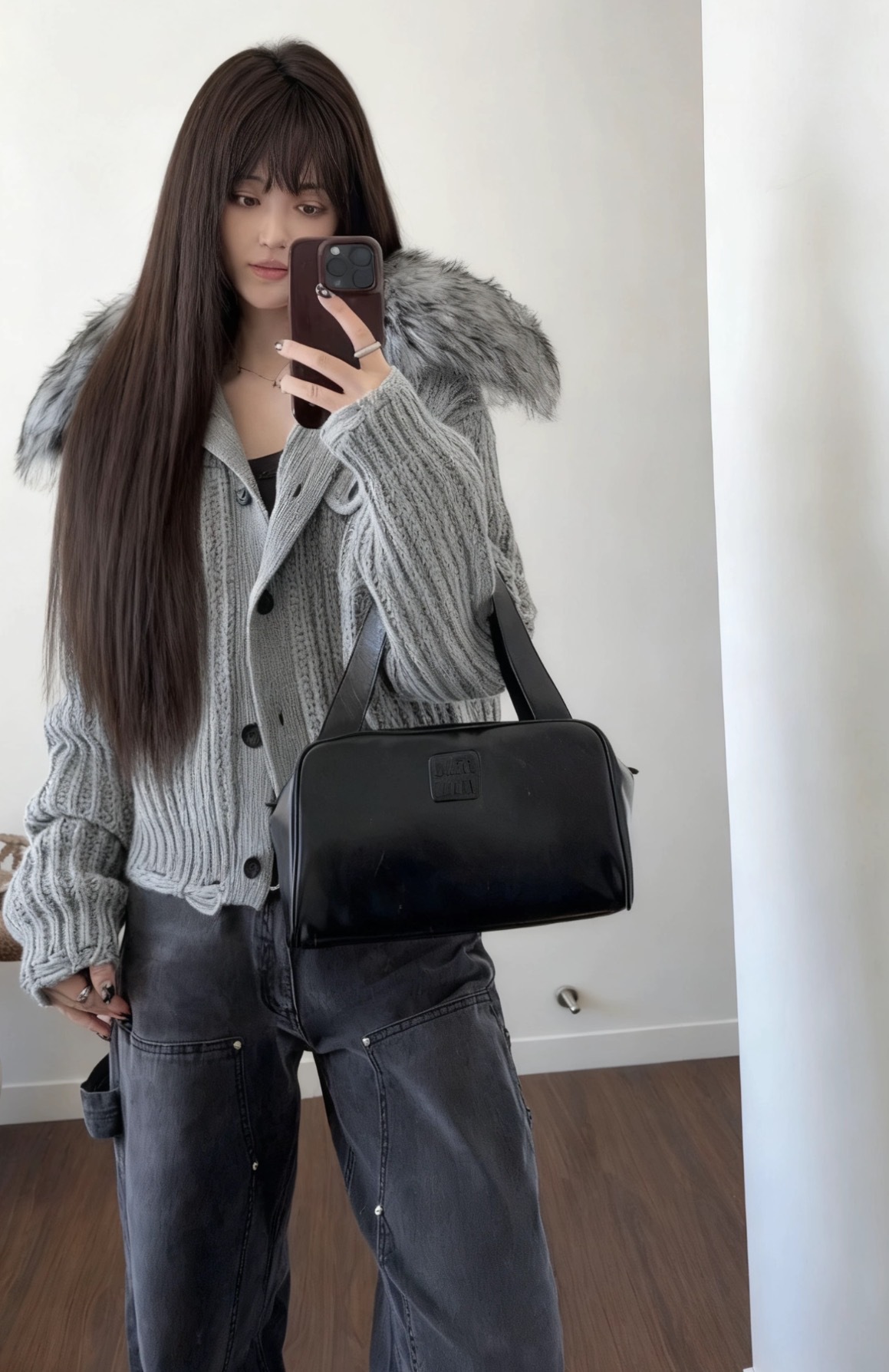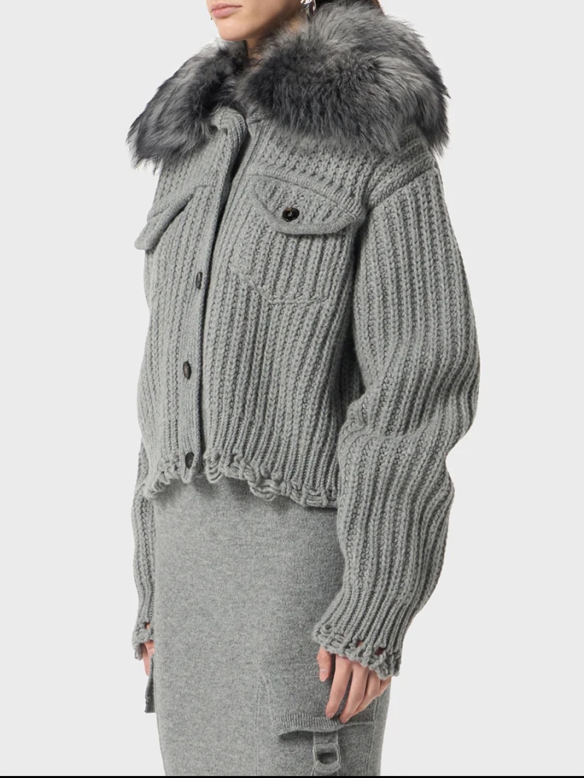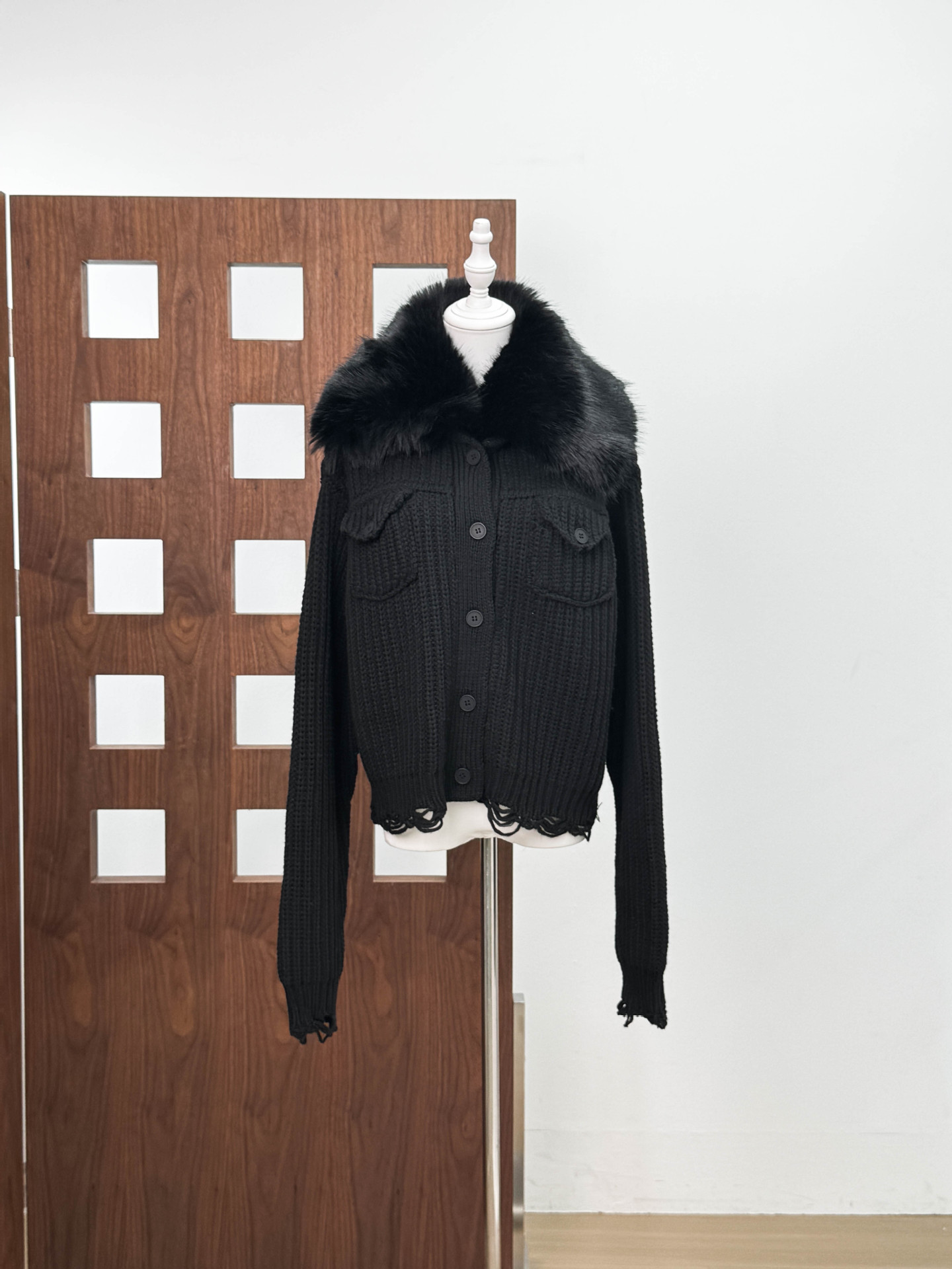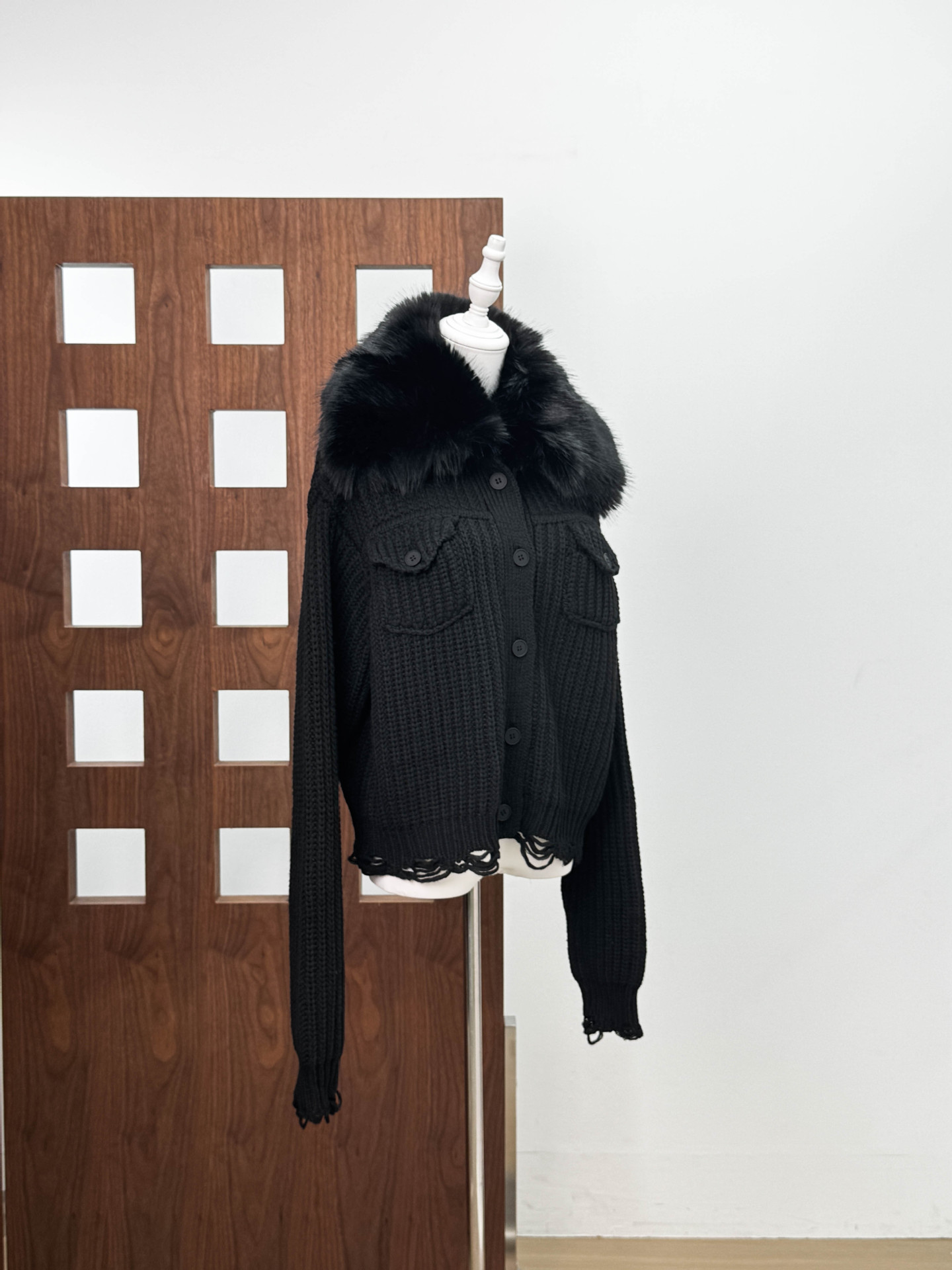正确版blu~秋冬新款大毛领加厚可拆卸螺纹针织开衫短外套