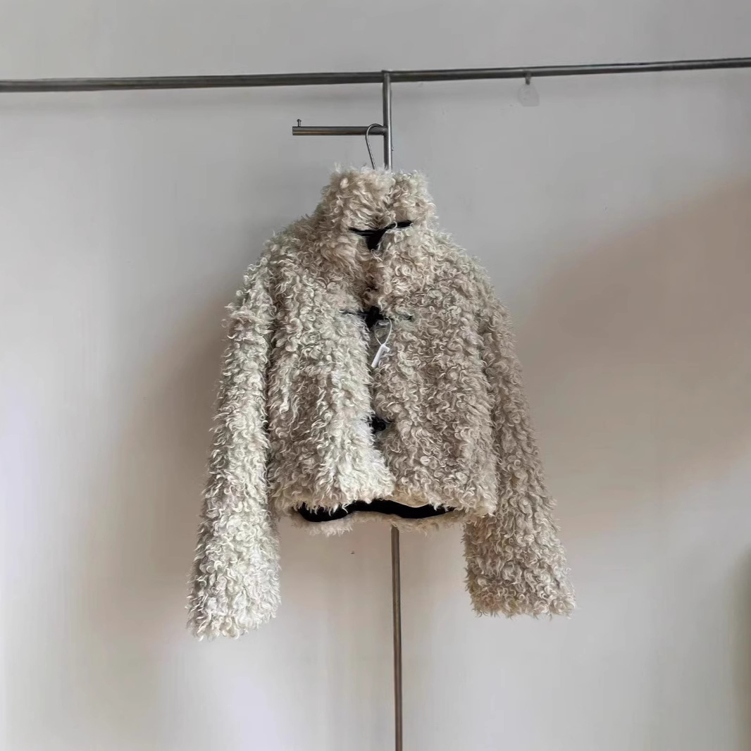 25秋冬新款仿生白底咖纹晕染环保皮草可翻折立领皮袢宽松短款外套