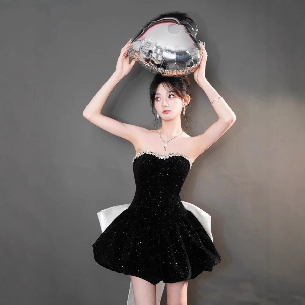 カカと同じスタイルのベトナムニッチL@ne ciキュートで甘いベルベットチューブトップリボンパーティードレス