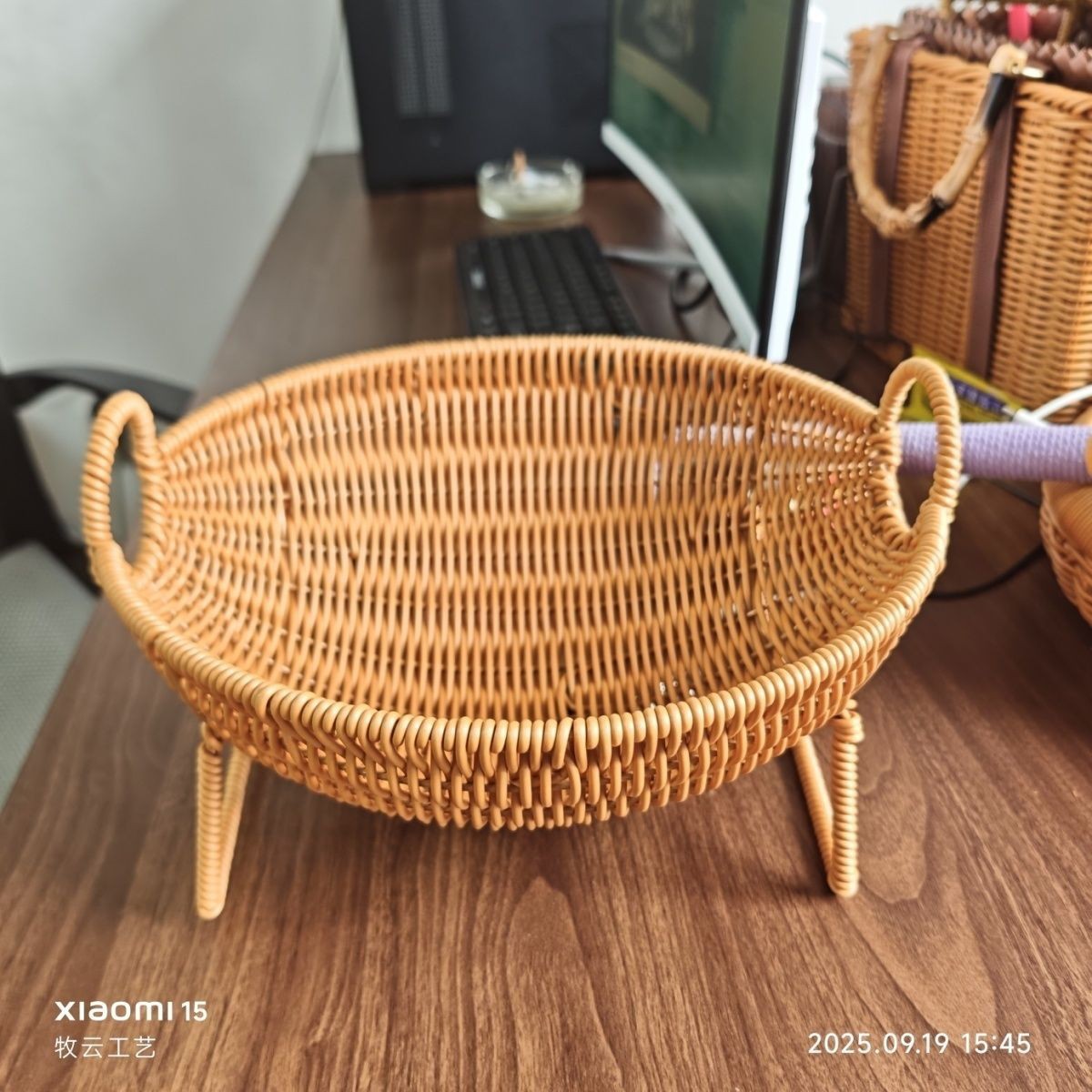 模造籐織りラウンドスナックナッツトレイデスクトップ小物収納バスケットコンパートメント手織りフルーツトレイ