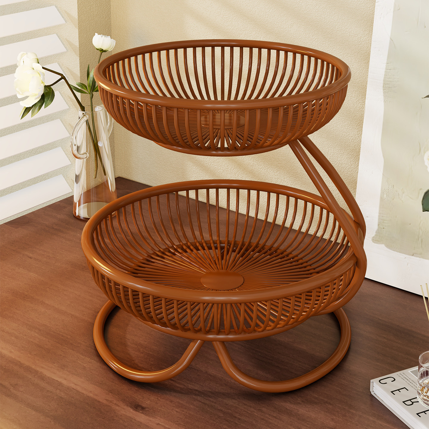 创意多层水果篮客厅年货零食糖果收纳架下午茶托盘仿藤编收纳篮