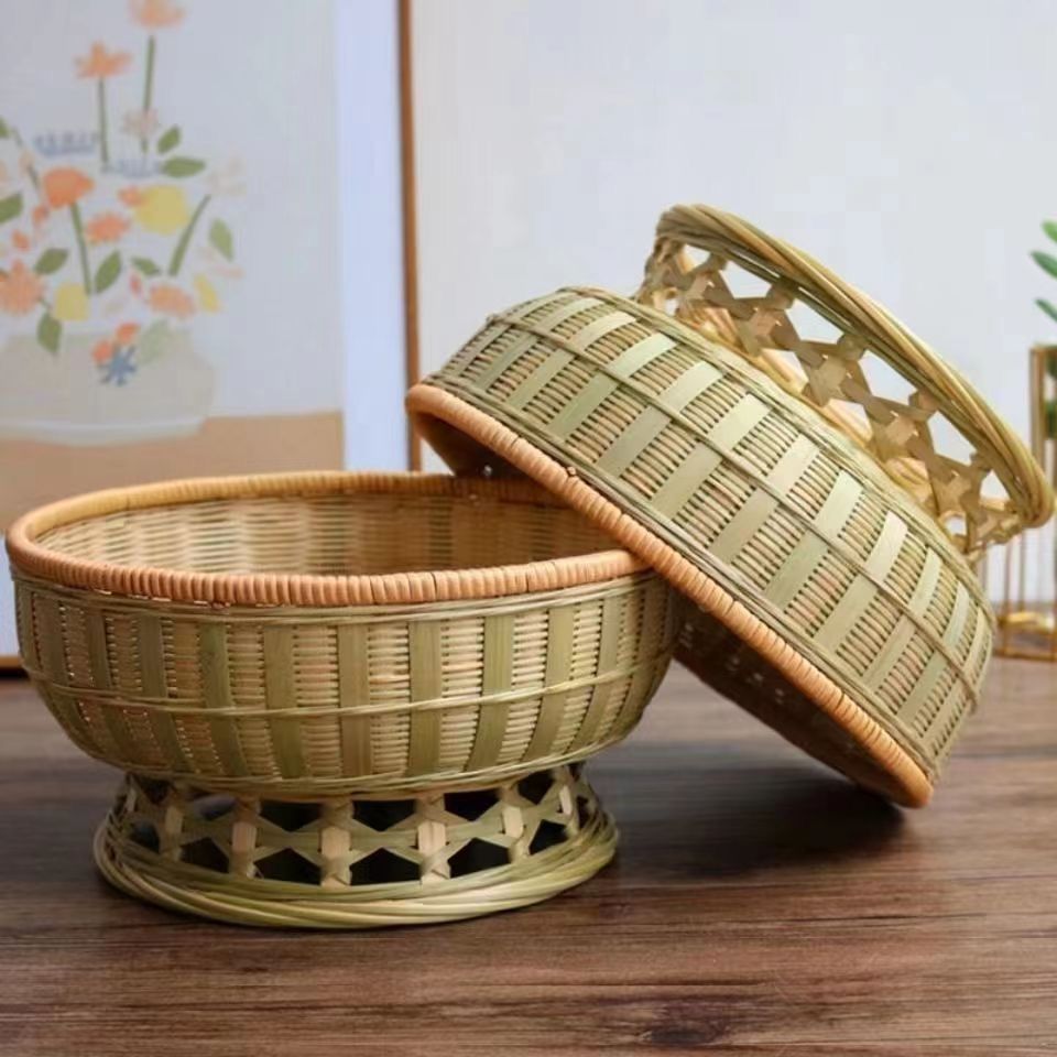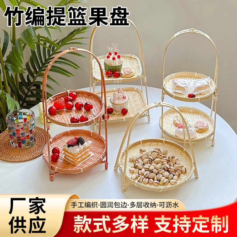 竹制品手工编织果盘多层茶点盘展示架竹编提篮酒店糕点篮零食果盘