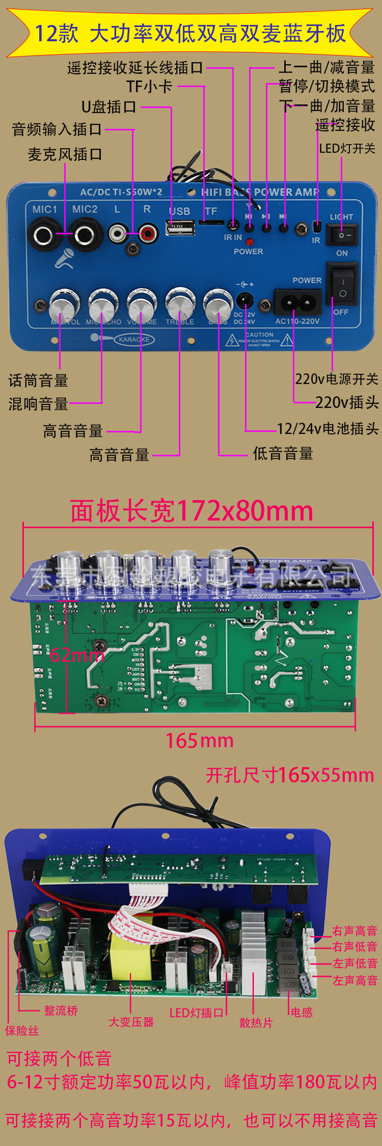 S50W*2大功率100w蓝牙功放板双低音50瓦x2双高低音炮蓝牙音箱双咪