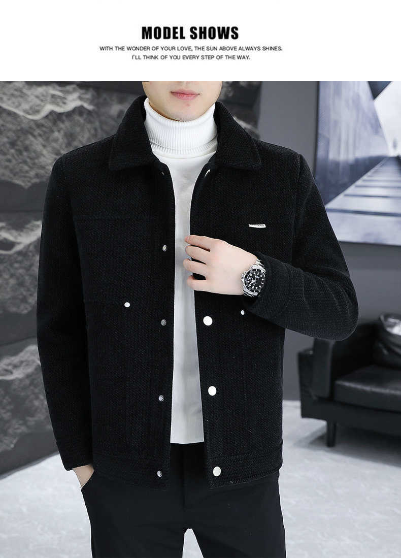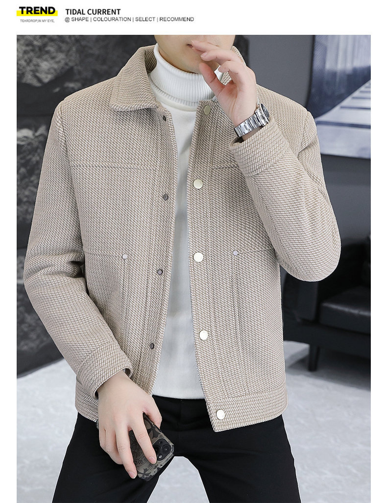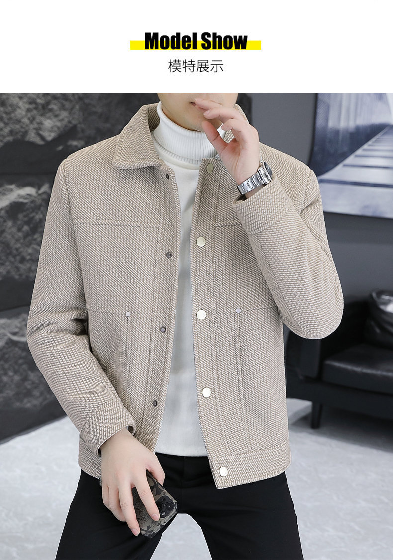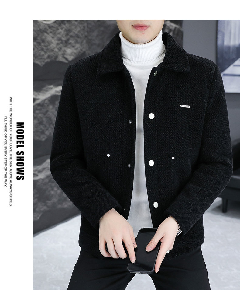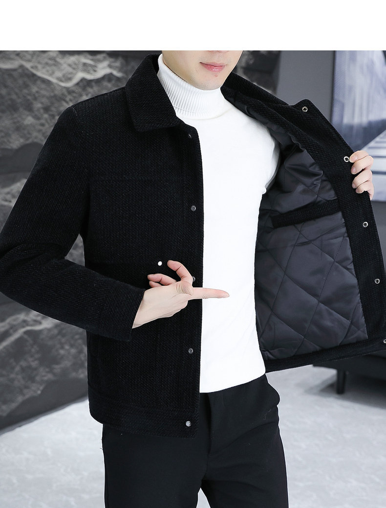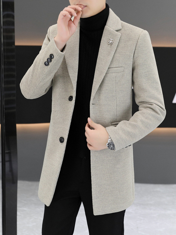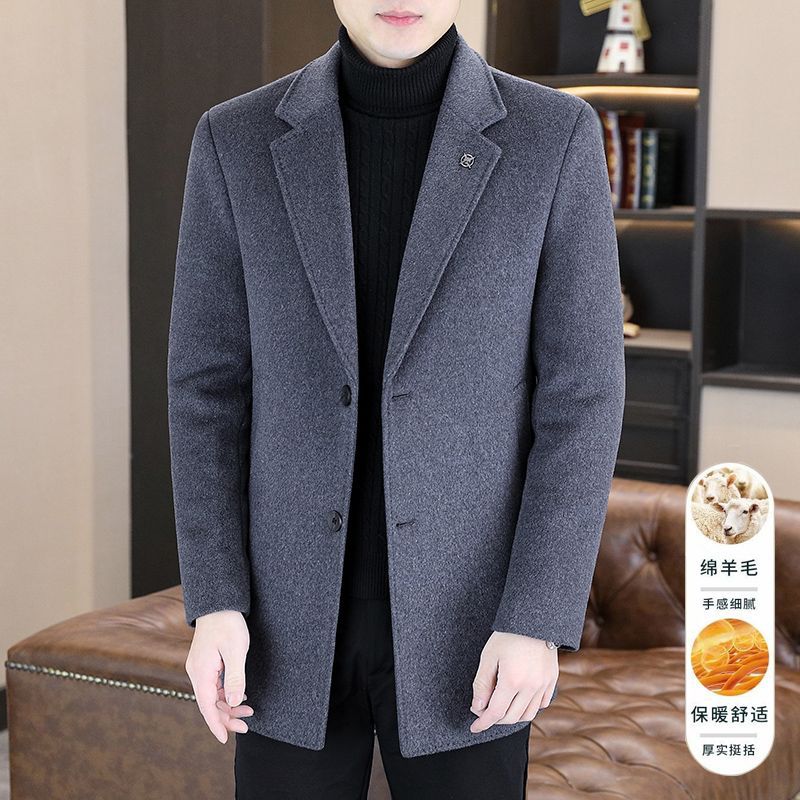 秋冬用裏起毛厚手羊毛ウールコート、新作メンズ若者向けラペル付きウールコート、保温性のあるウールジャケット