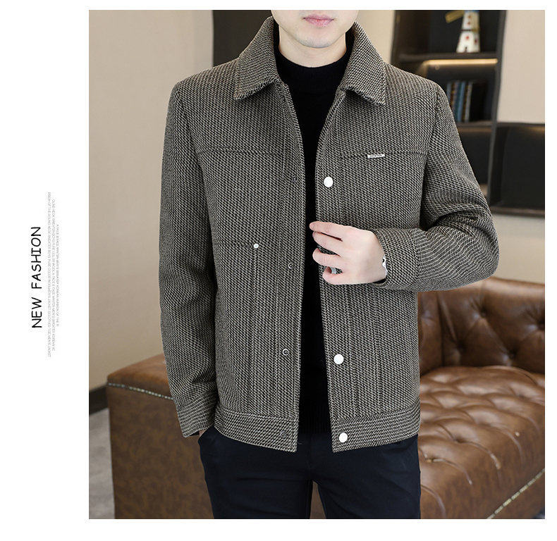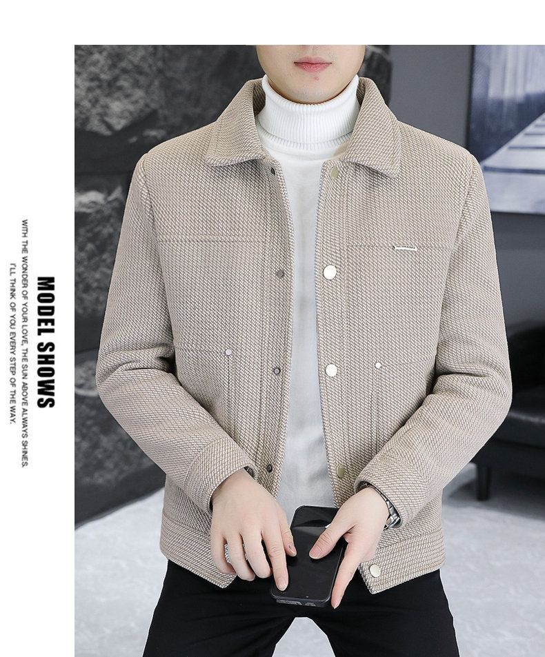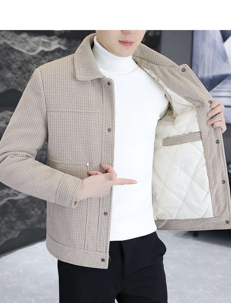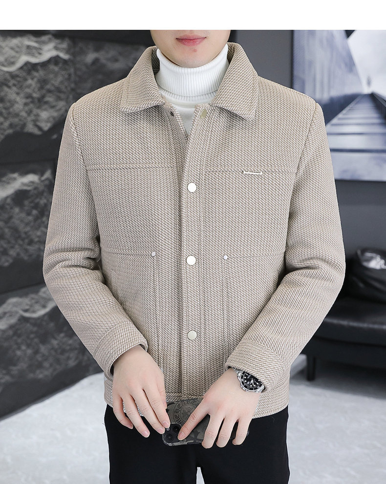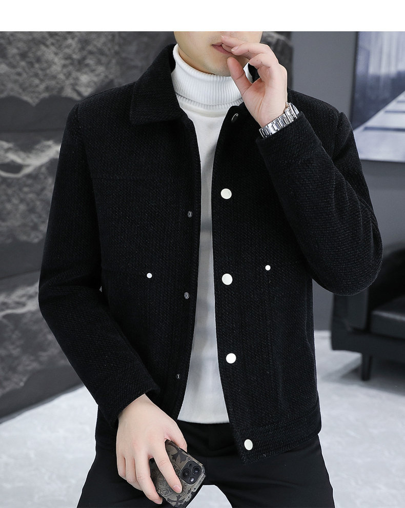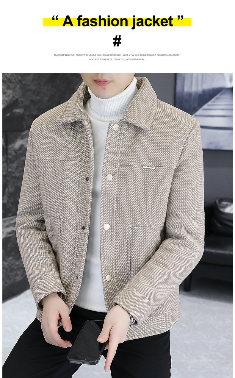 秋冬用裏起毛厚手羊毛ウールコート、新作メンズ若者向けラペル付きウールコート、保温性のあるウールジャケット