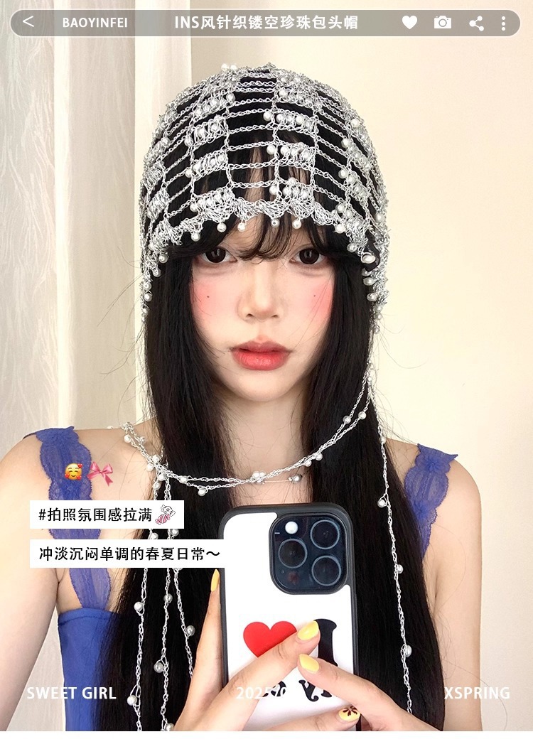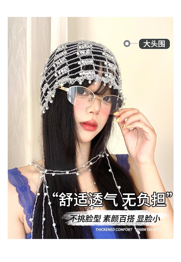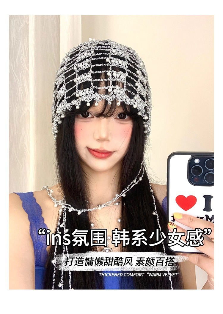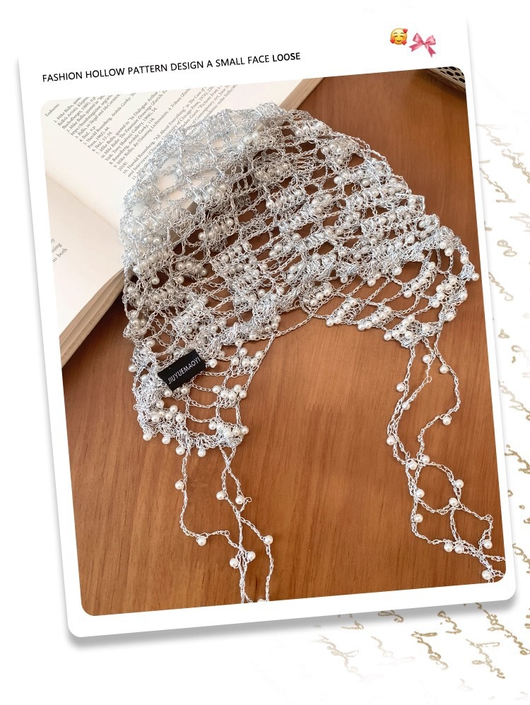 手工银链珍珠流苏镂空帽子女小众设计感显脸小包头帽百搭套头帽子