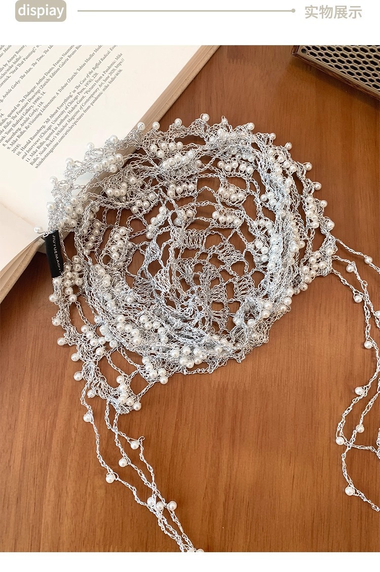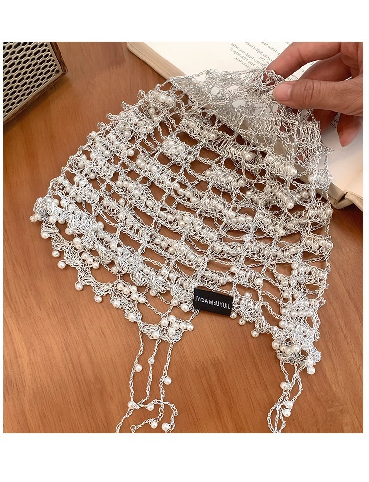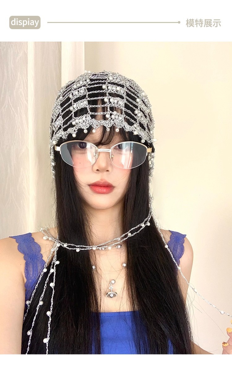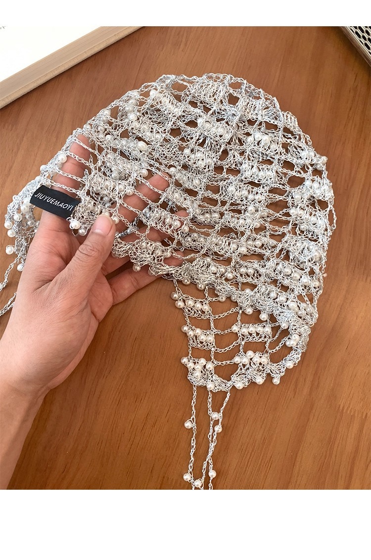 手工银链珍珠流苏镂空帽子女小众设计感显脸小包头帽百搭套头帽子