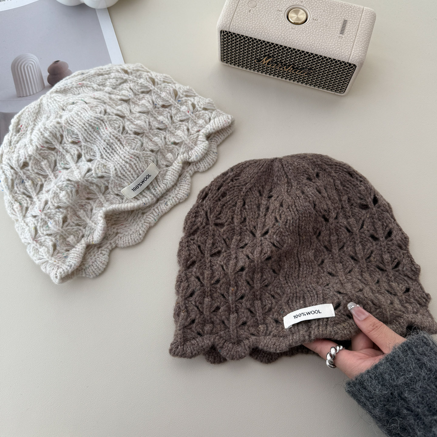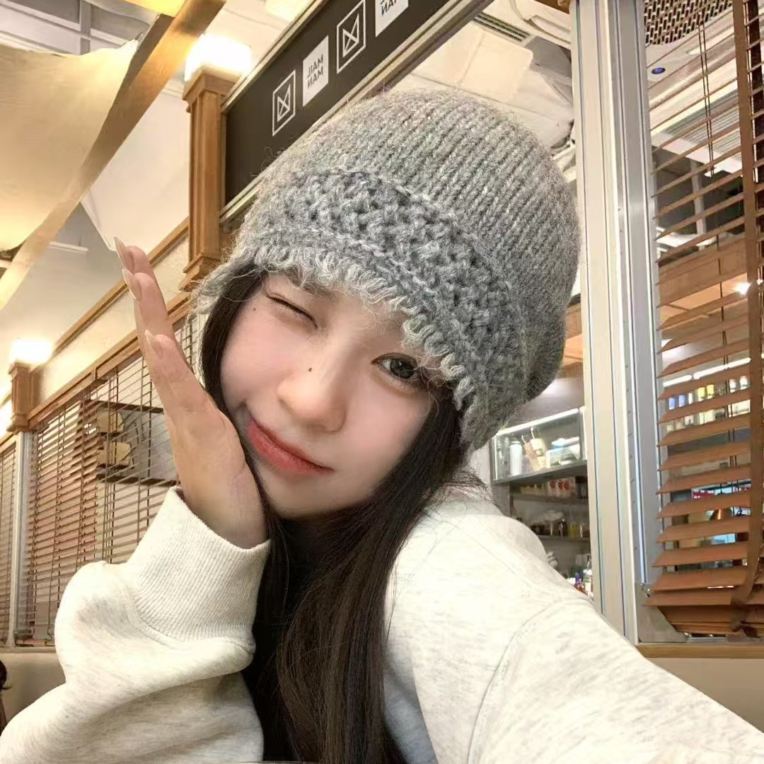 韩国博主100%纯羊毛菠萝针织镂空包头帽早秋甜酷风冷帽花边套头帽
