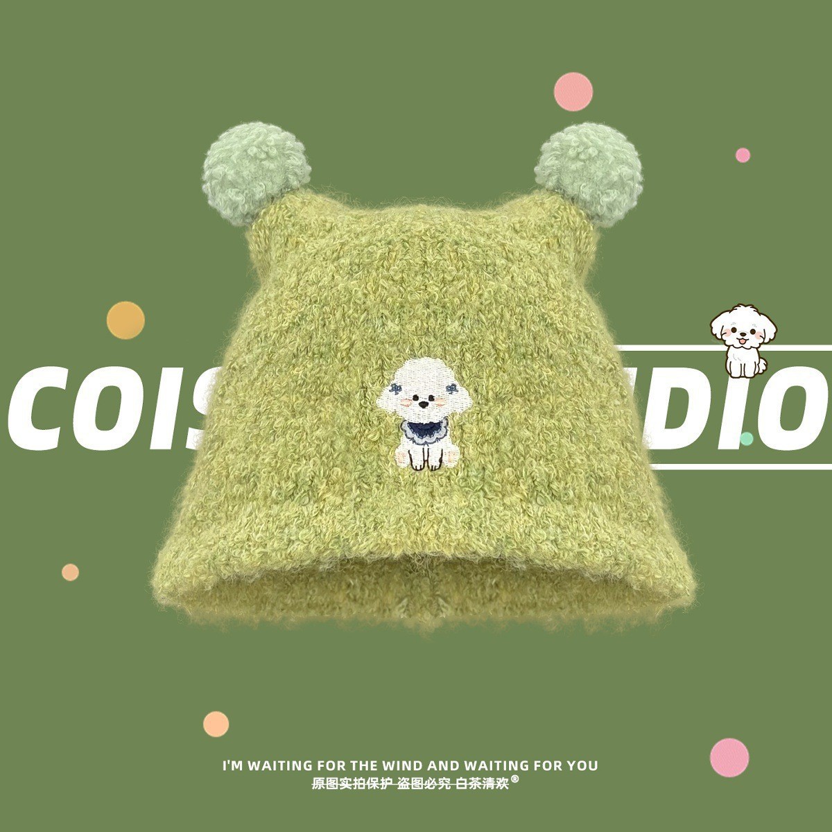 日系可爱小狗刺绣卡通毛绒针织渔夫帽女秋冬保暖显脸小护耳毛线帽