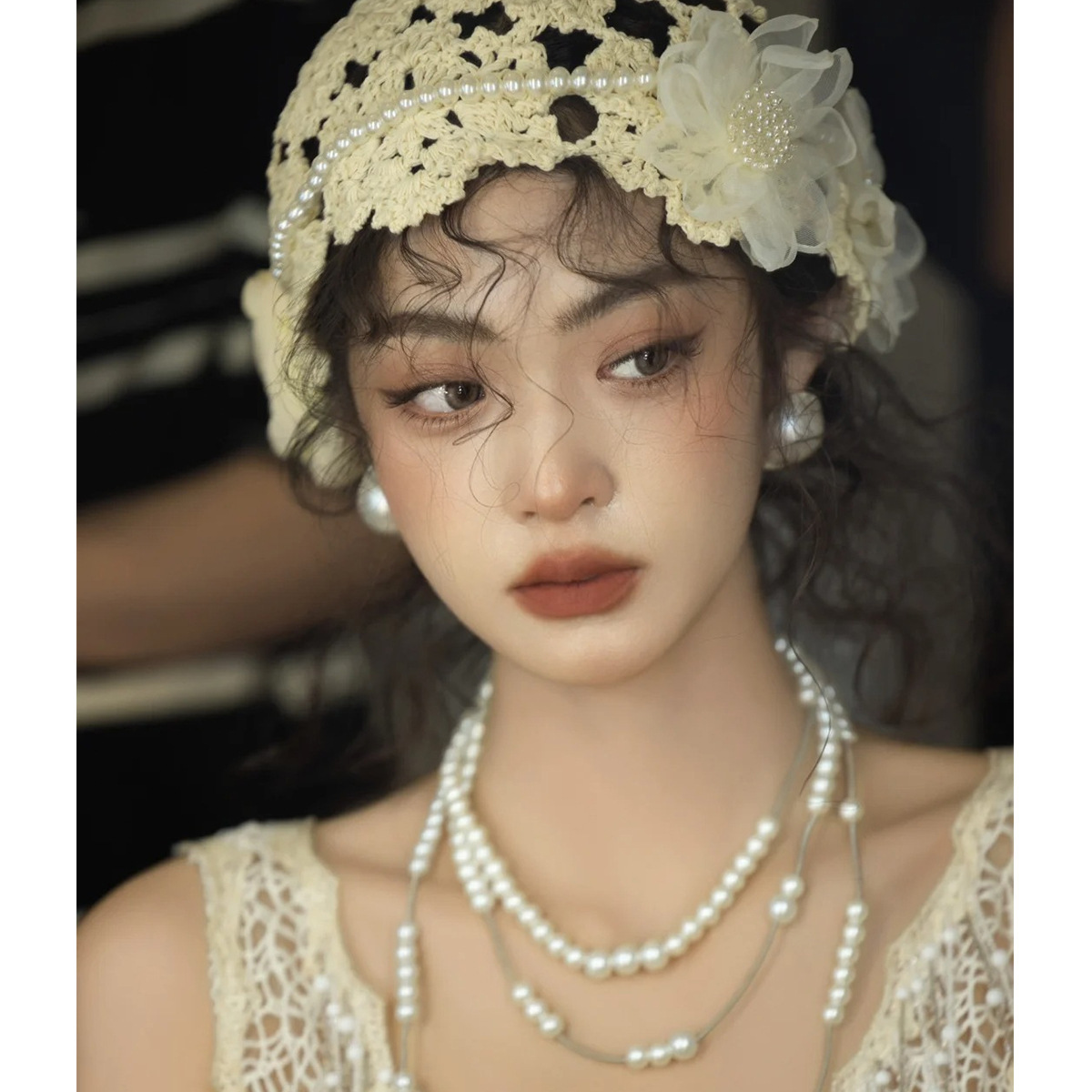 批发手工金属链珍珠镂空帽子女小众设计感显脸小包头帽流苏套头帽