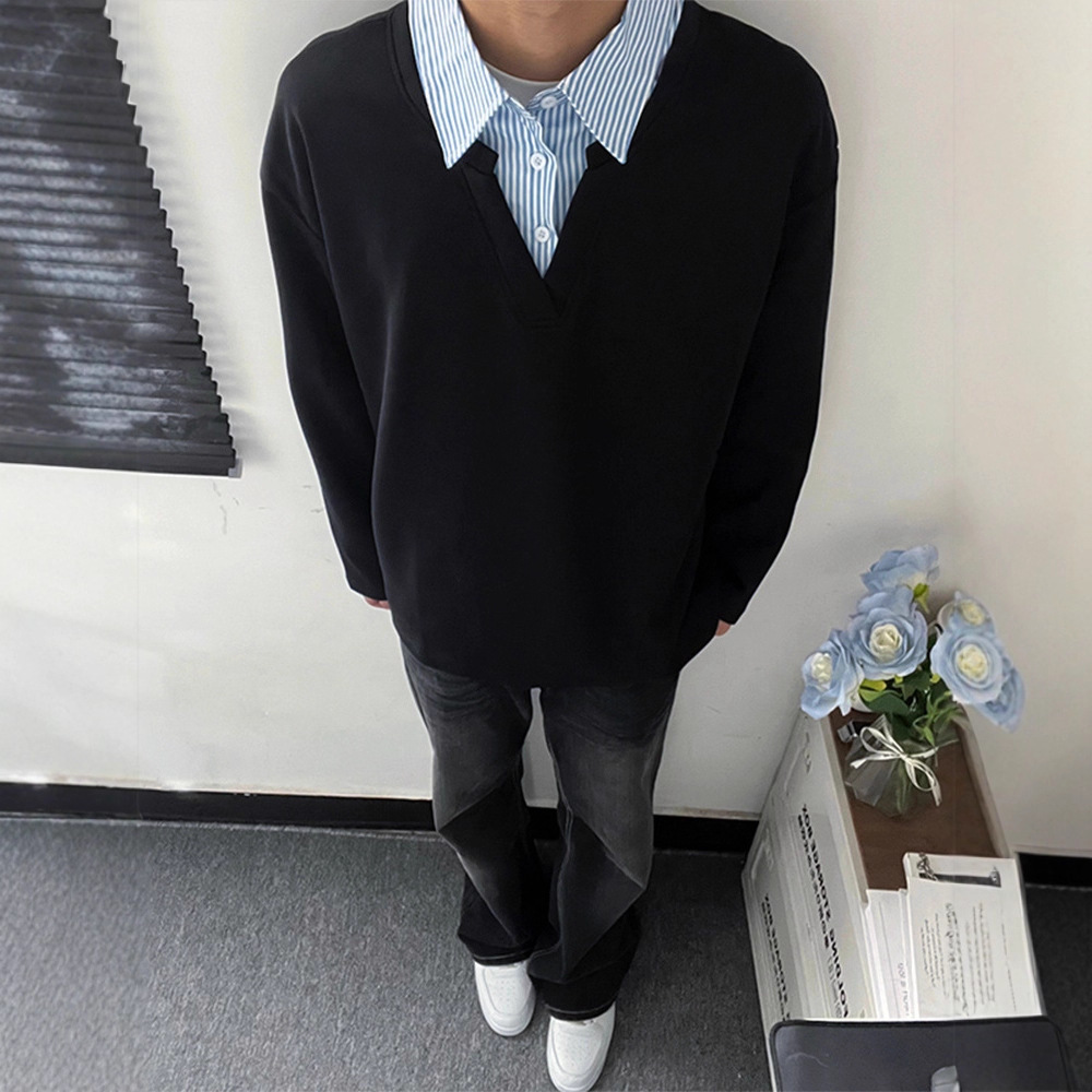 偽の2枚のシャツの襟の衛衣の男性の春秋の潮牌の小さい大衆のデザイン感のアメリカのストライプは重いポンドの長袖のtシャツをつなぎ合わせます。