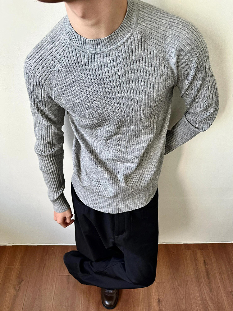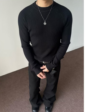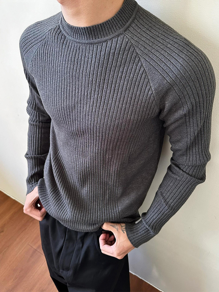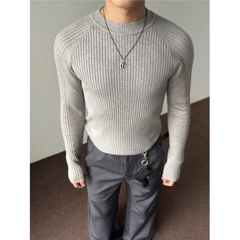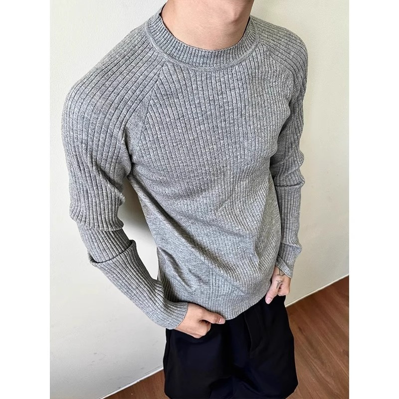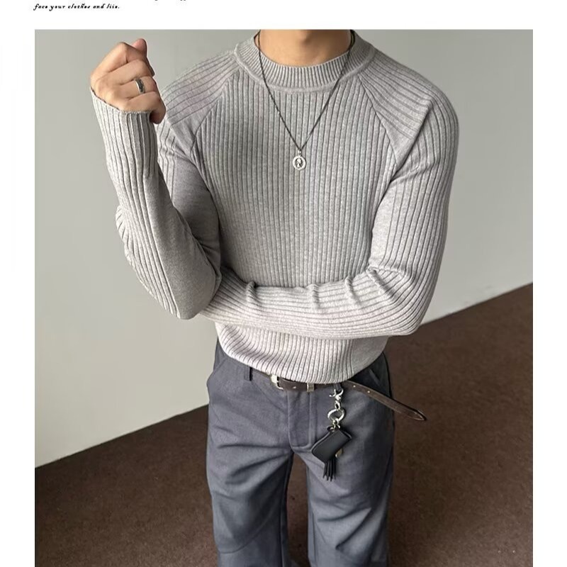 外贸老钱风条针织毛衣男修身内搭长袖打底衫简约百搭圆领男士上衣