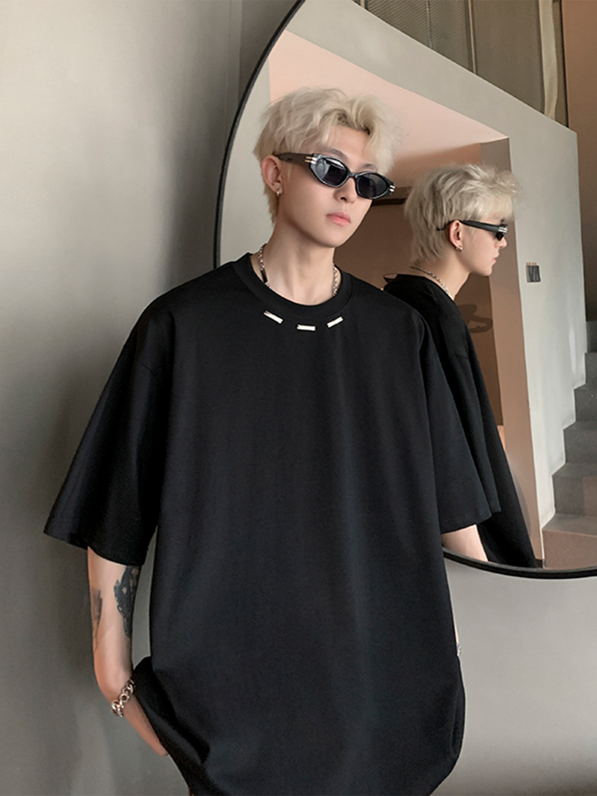 重いポンドの小さい大衆の半袖のtシャツの男性の項のアメリカの街頭の潮流のcleanfitのごろつきのかっこいい設計感の丸首の5分の袖