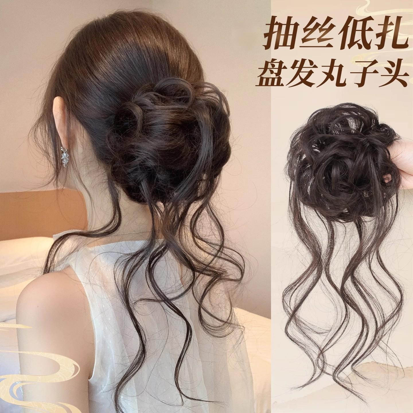 氛围感抽丝龙须低花苞丸子头假发发圈蓬松增发量神器新中式盘发包
