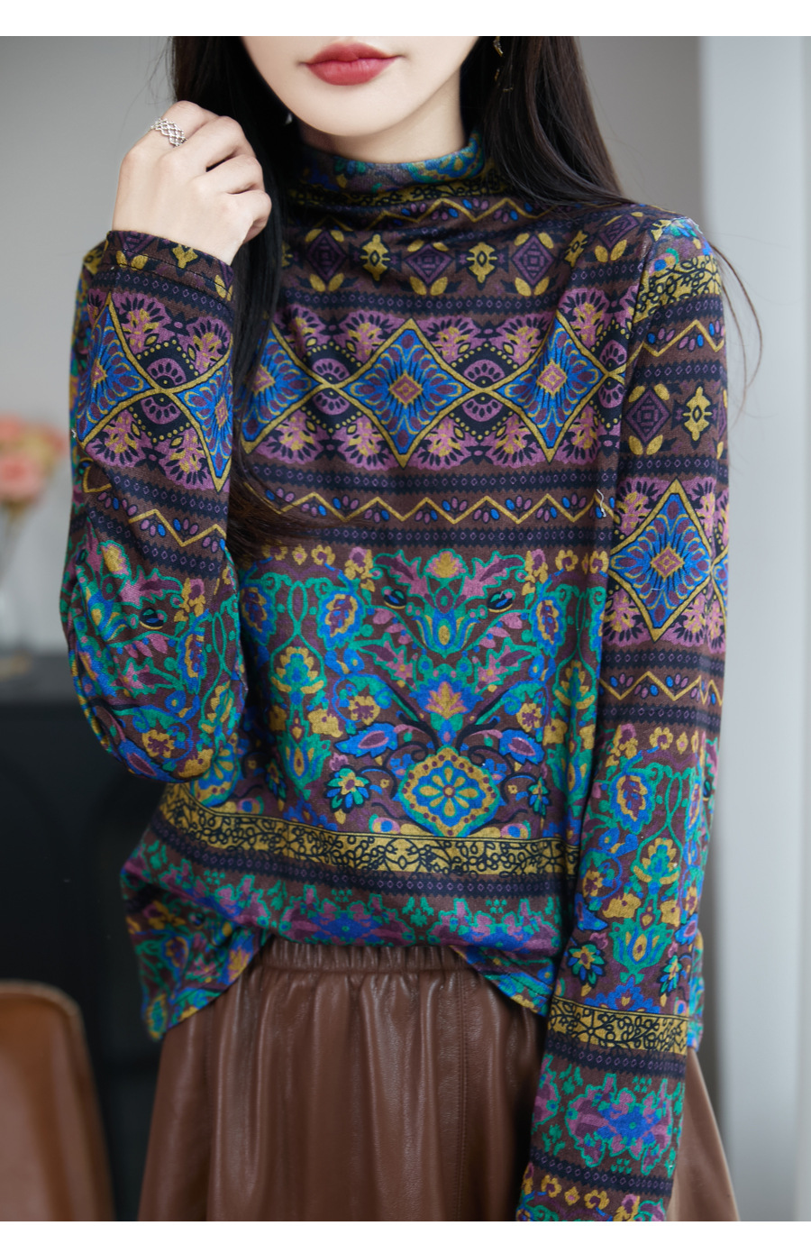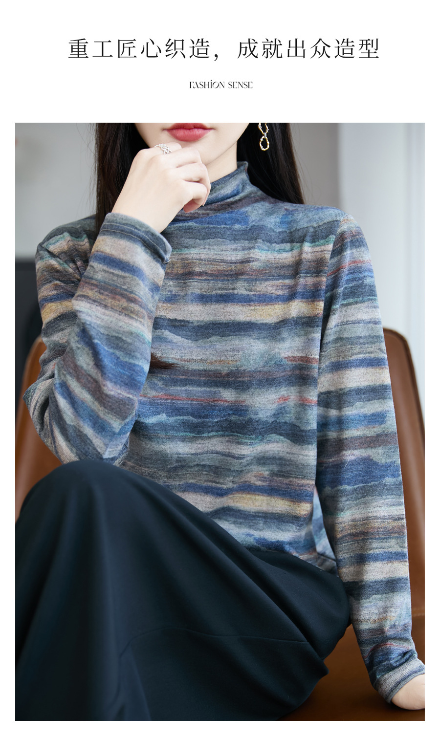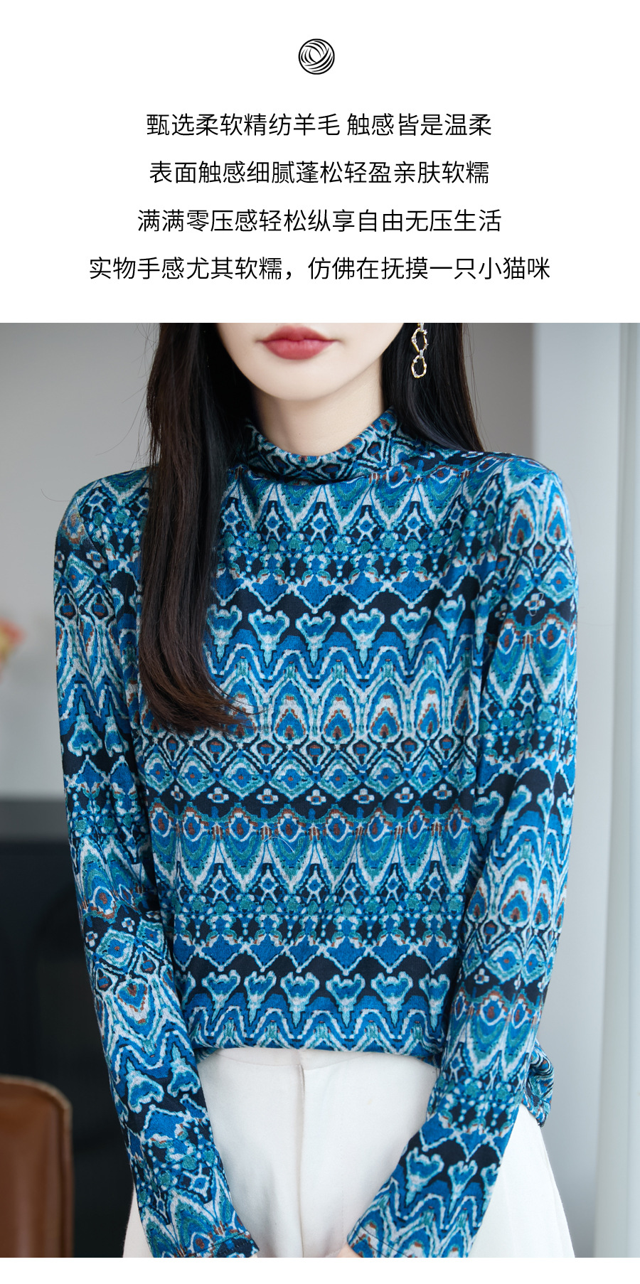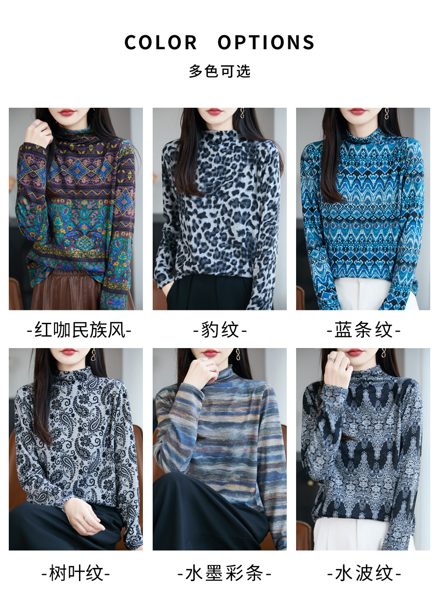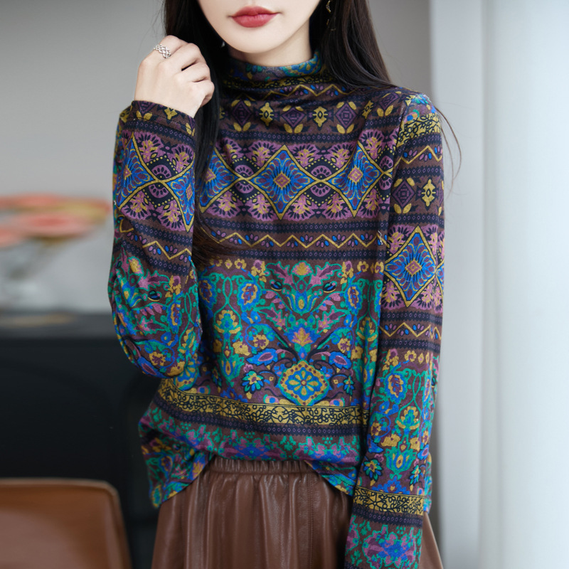 民族风半高领印花针织衫女精纺细羊毛毛衣秋冬修身内搭长袖打底衫