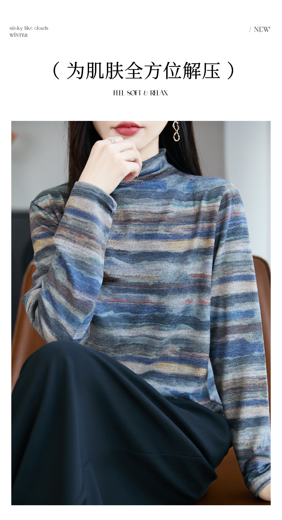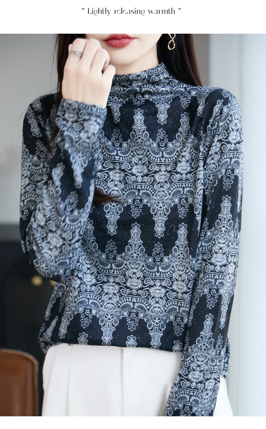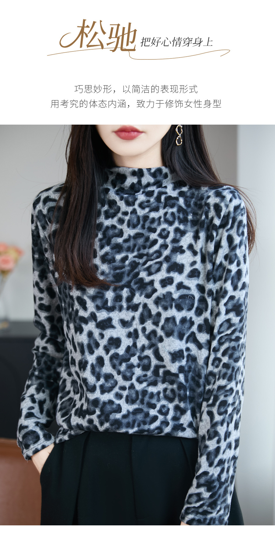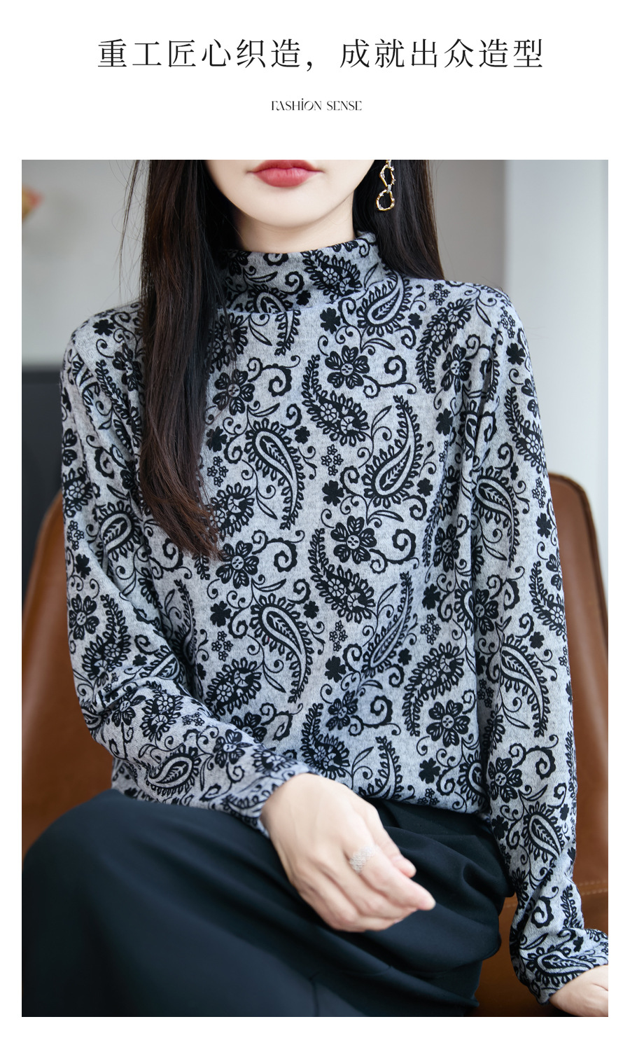 法式半高领印花精纺毛针织衫女2025新款宽松显瘦长袖保暖打底毛衣