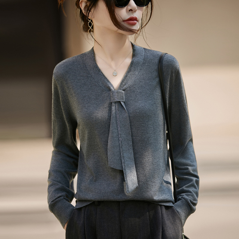 25年早秋新款精纺羊毛V领针织衫长袖飘带拼色套头宽松打底衫上衣