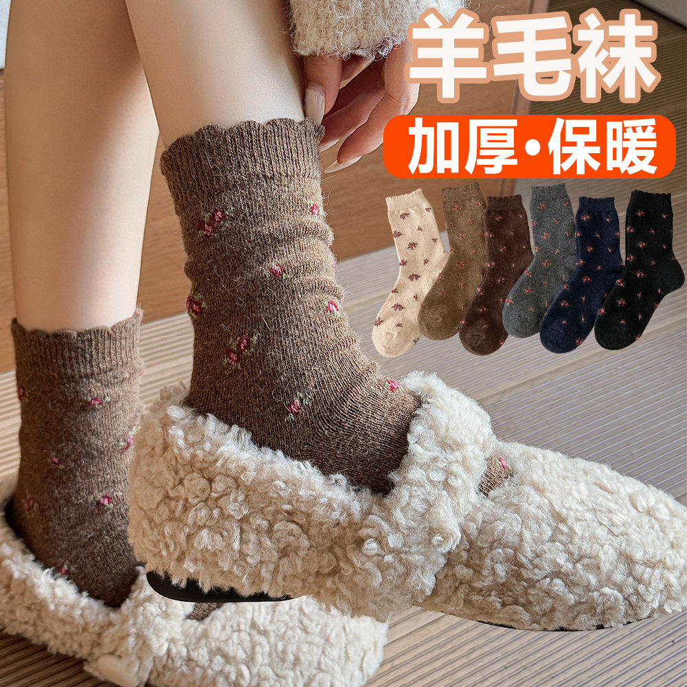 复古碎花羊毛袜堆堆袜秋冬加厚保暖韩系碎花小众原创花边袜配勃肯