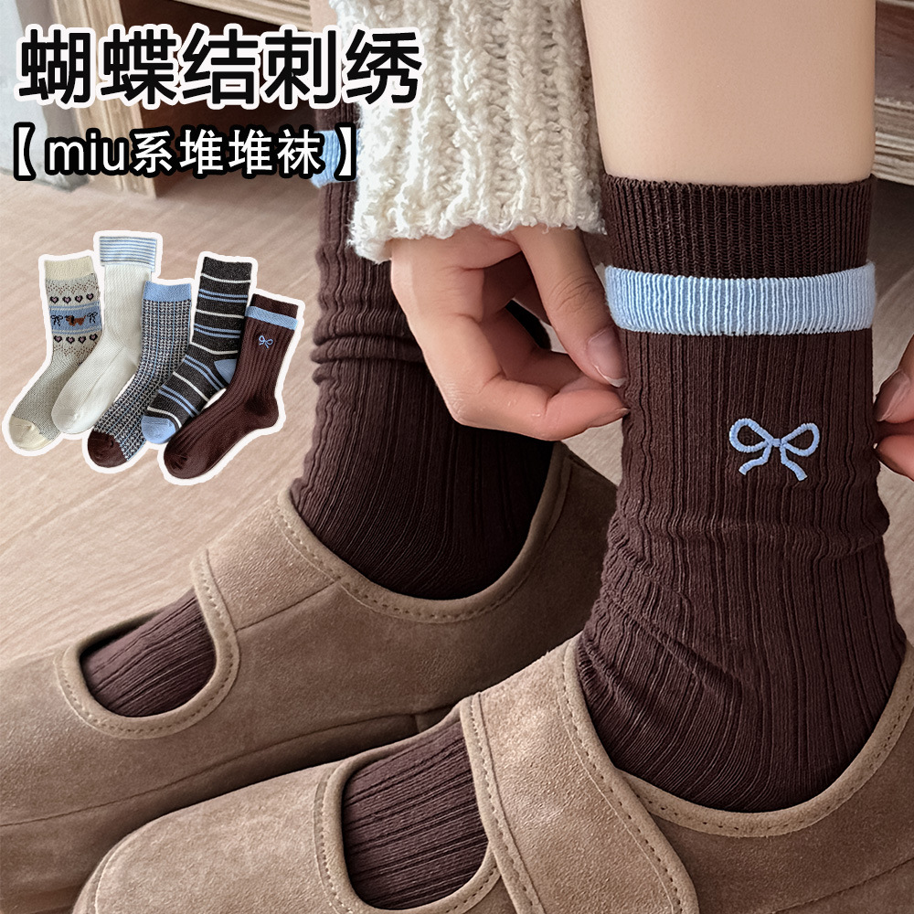 秋冬堆堆袜女双针中筒袜复古风条纹搭配乐福鞋时尚潮流百搭森系