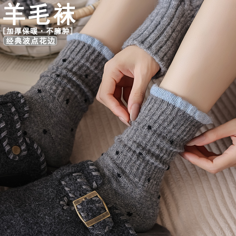 波点羊毛袜子女款秋冬加厚中筒袜保暖灰色复古花边长袜堆堆袜