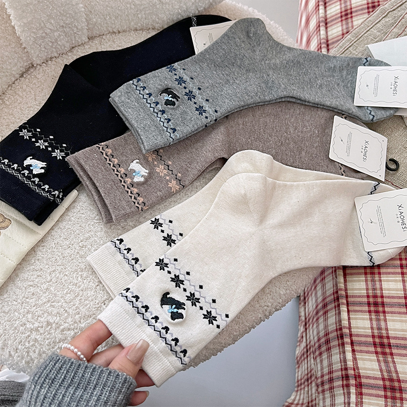 袜子女秋冬费尔岛中筒袜新款棉袜吸汗透气刺绣韩版长袜批发零售