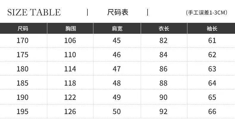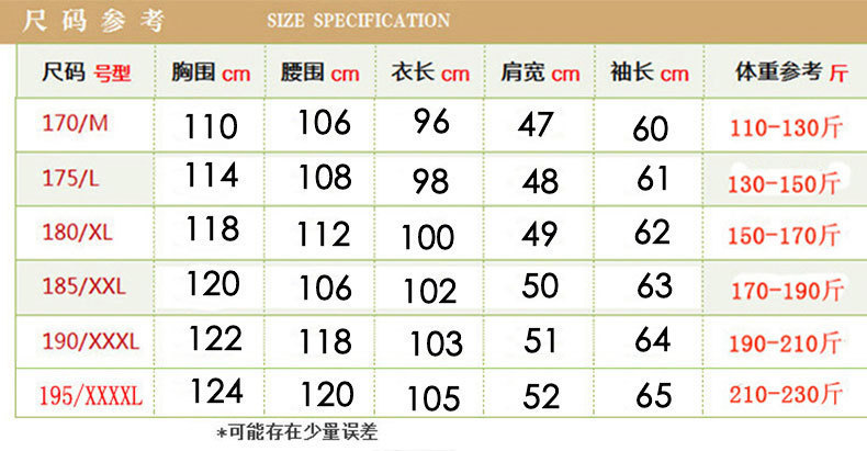尺码 170(体重100斤~125斤),175(体重125斤-140斤),180(体重140斤-155斤),185(体重155斤-170斤),190(体重170斤-185斤),195(体重185斤-200斤)