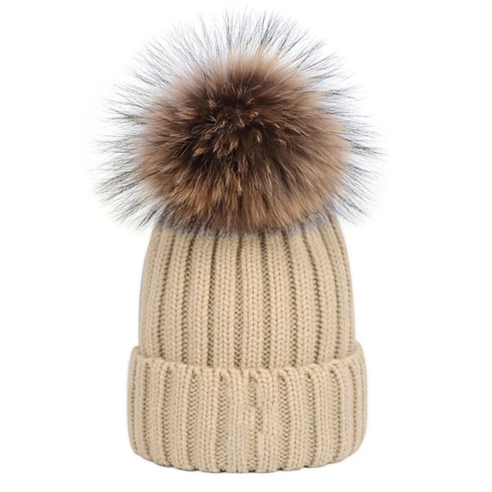 女性用卸売耳保護ニット帽、韓国版ラクーンファーボール付きウール帽子、女性用厚手暖かいファー帽子、ドーム型