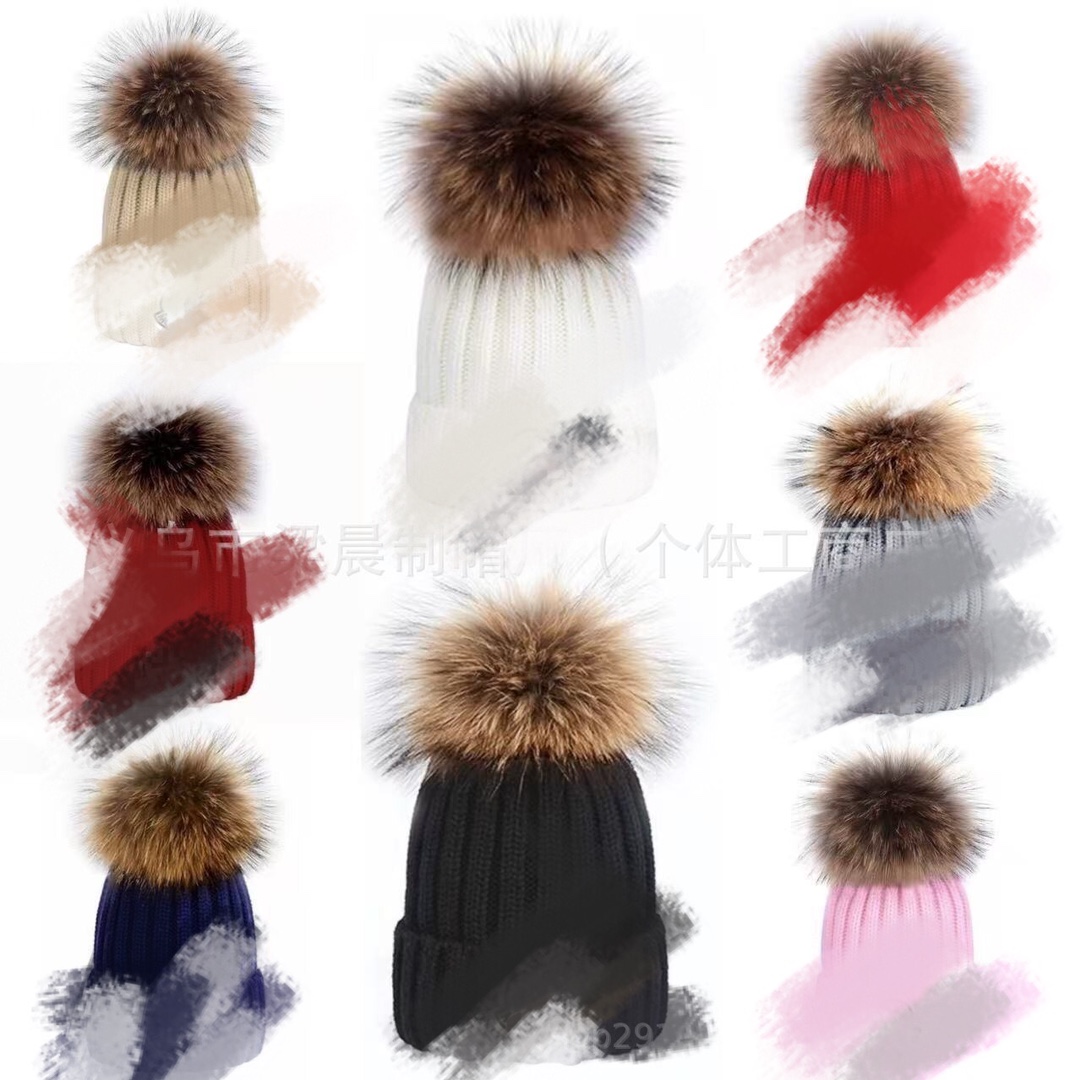 欧米の秋冬の新型の繊維の絨毯の芯の糸の毛糸の帽子のかぶせの帽子はタヌキの毛のボールのニットの帽子の親子の金をまねます。