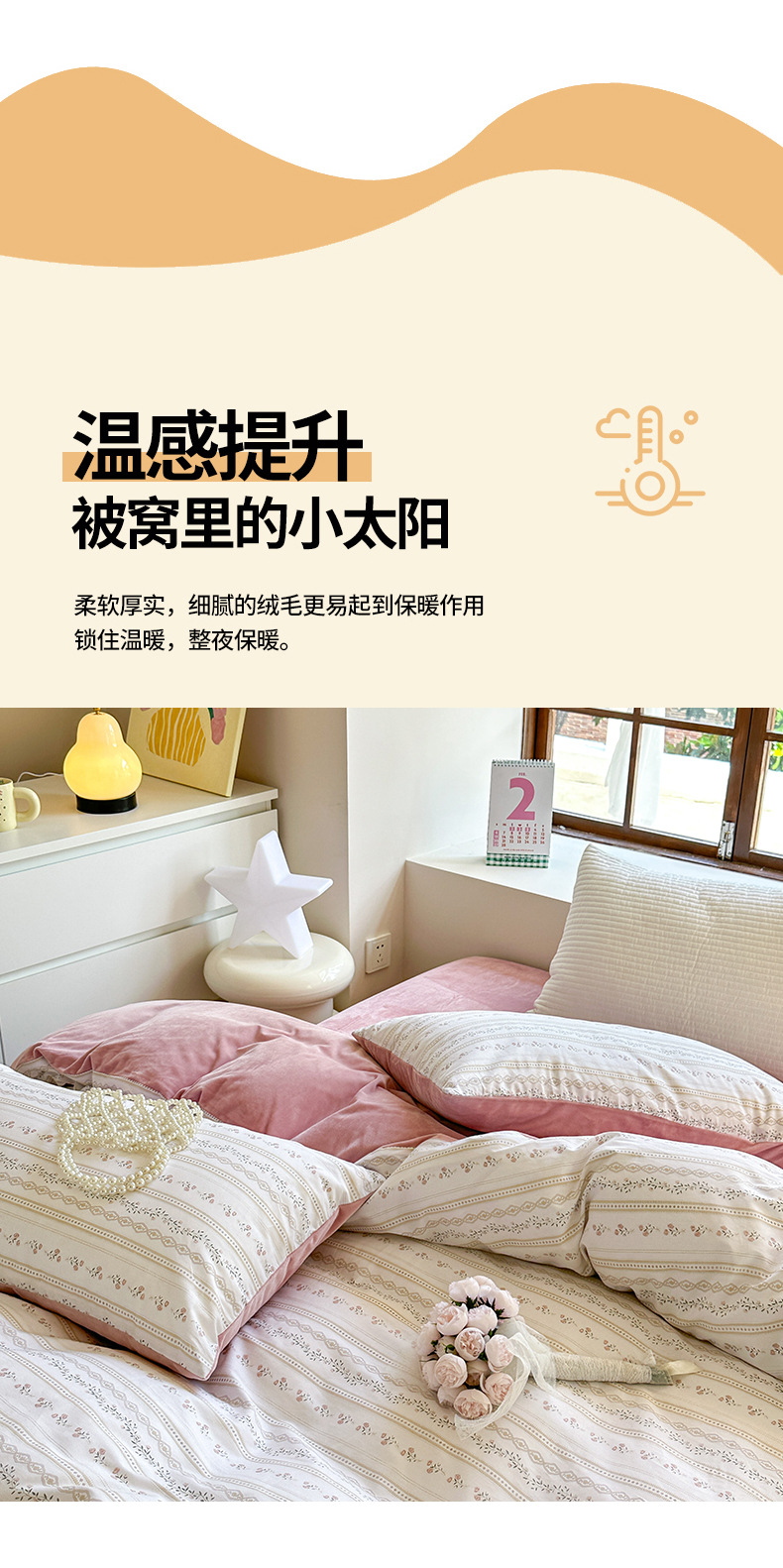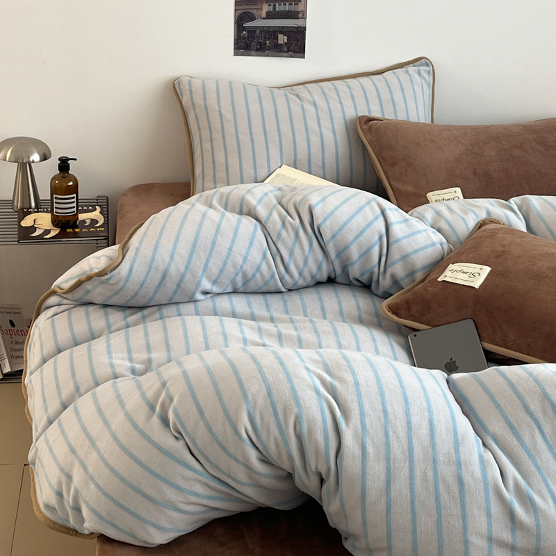 ins简约条纹牛奶绒床上四件套床单被套罩冬季加绒床笠学生三件套