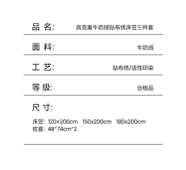 尺寸规格 120*200cm单床笠,150*200cm单床笠,180*200cm单床笠,枕套48*74cm一对