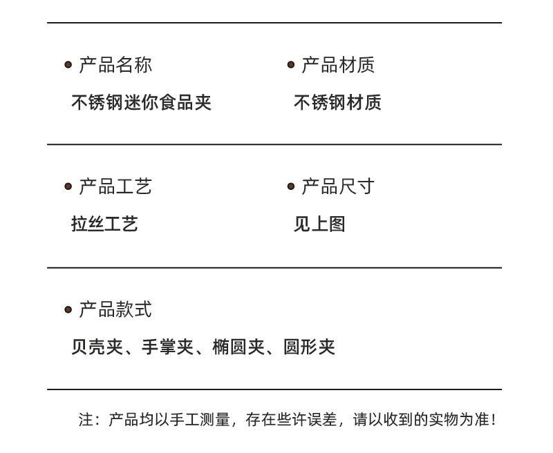 尺寸 贝壳夹,手掌夹,椭圆夹,圆形夹