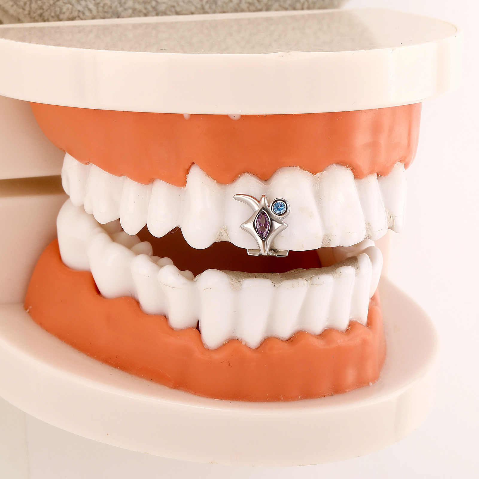 3、 金牙(银牙)放入嘴里,用上下牙轻轻咬合金牙。软掉的硅胶受到牙齿的挤压在使用者口腔中调整型状,与齿形匹配,起到固定定型的作用。