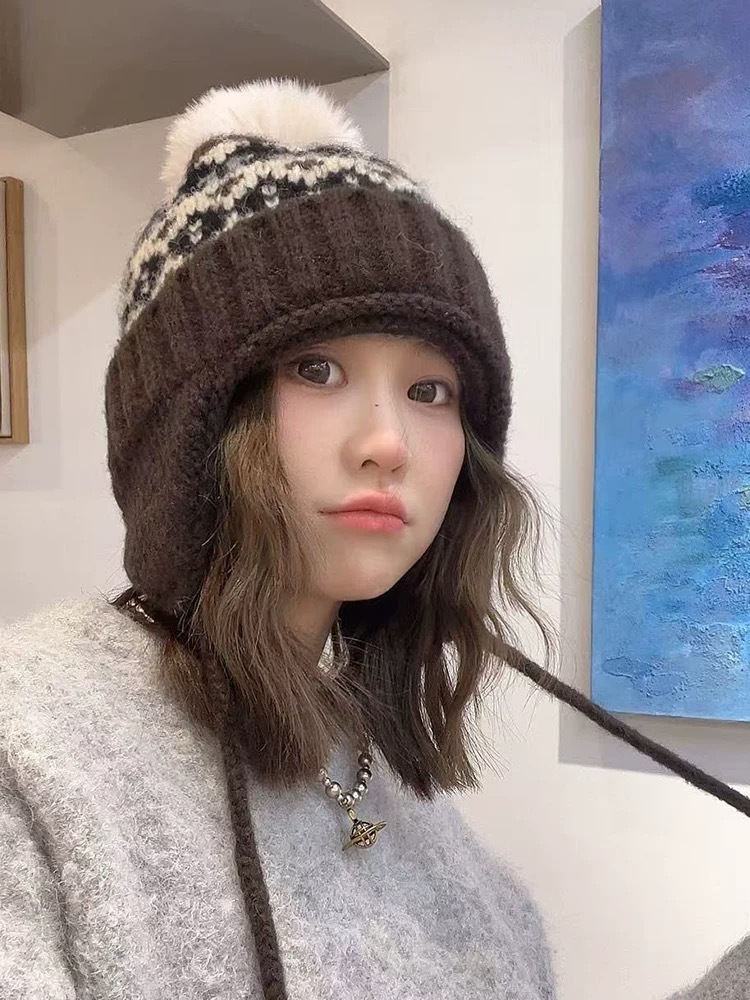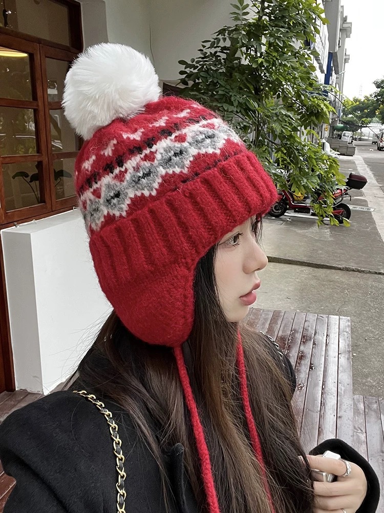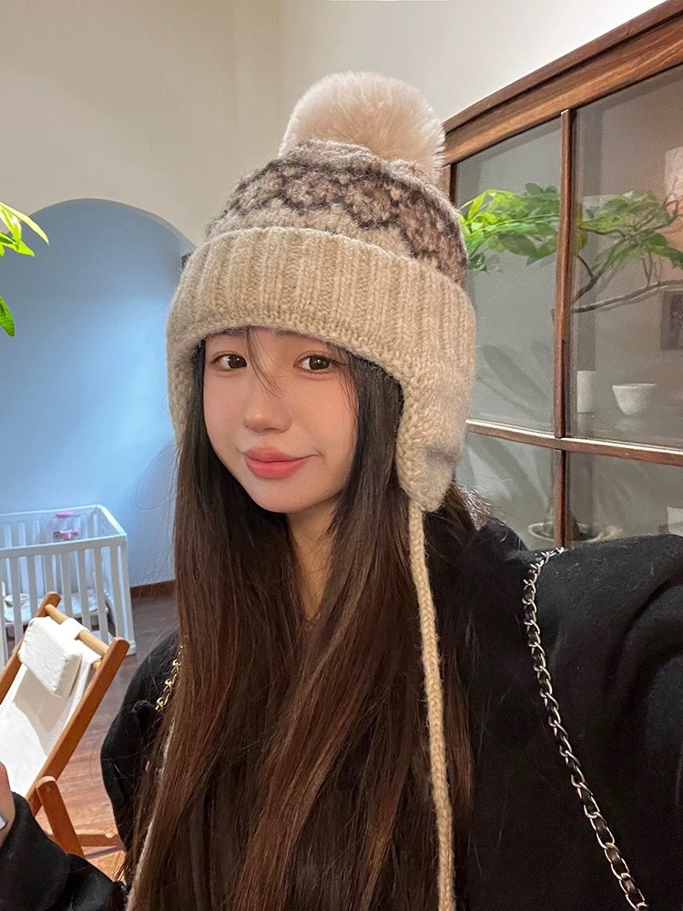 冬季保暖女帽费尔岛复古提花毛线帽子女雪天加厚保暖护耳帽针织帽