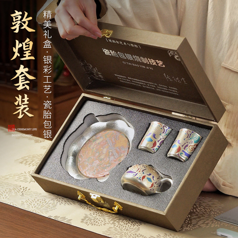 国色天香鎏银茶具旅行功夫套装一壶四杯高端轻奢茶壶礼盒中秋乔迁