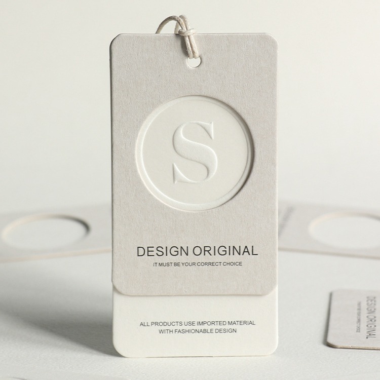 衣料品店のブランドの高級婦人服のラベルの服の看板の特殊な紙の深圧凹の工芸はカードの紳士服を掛けて注文して作らせます。