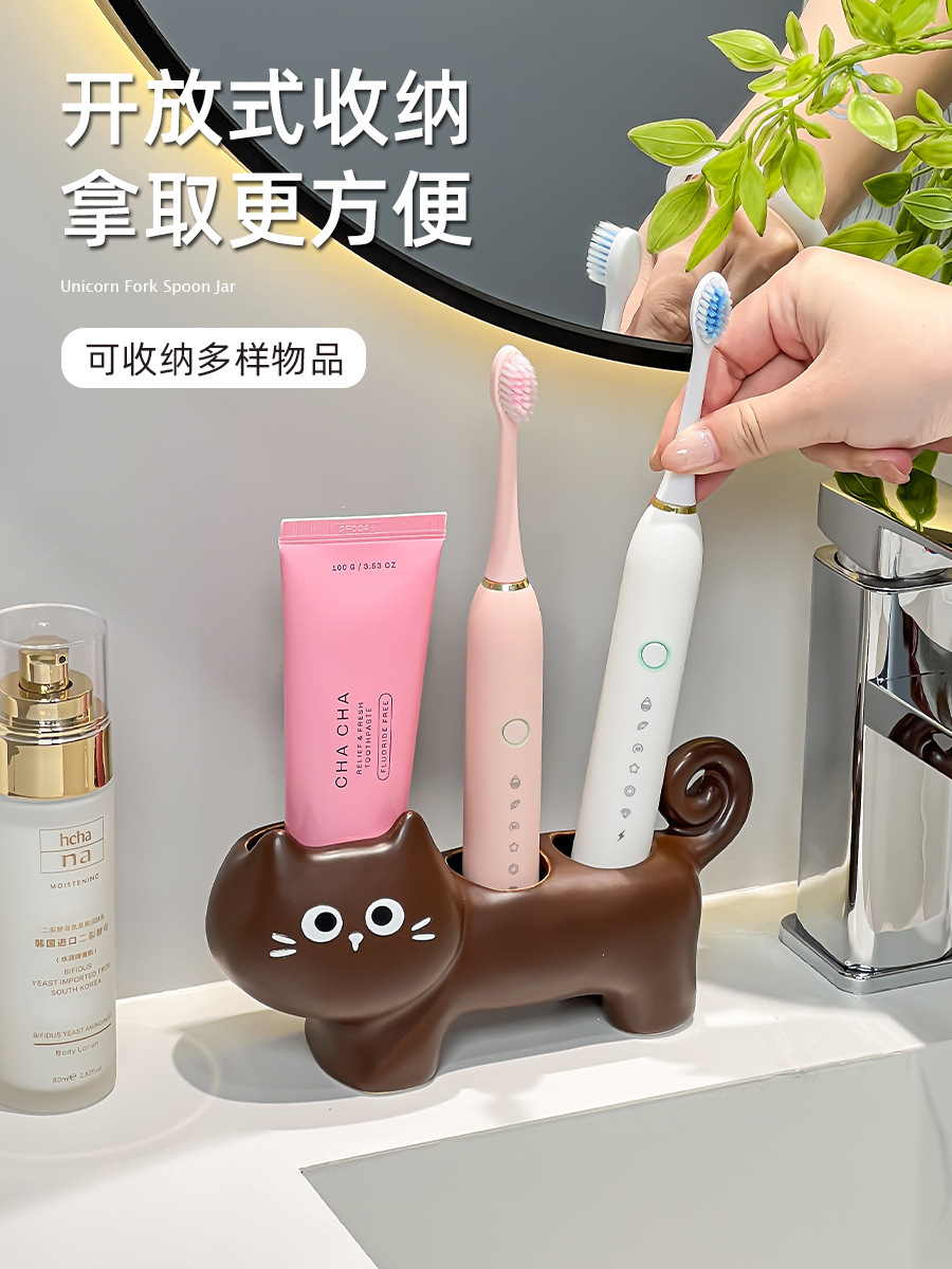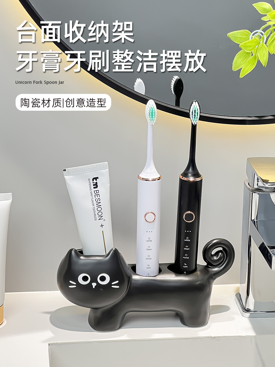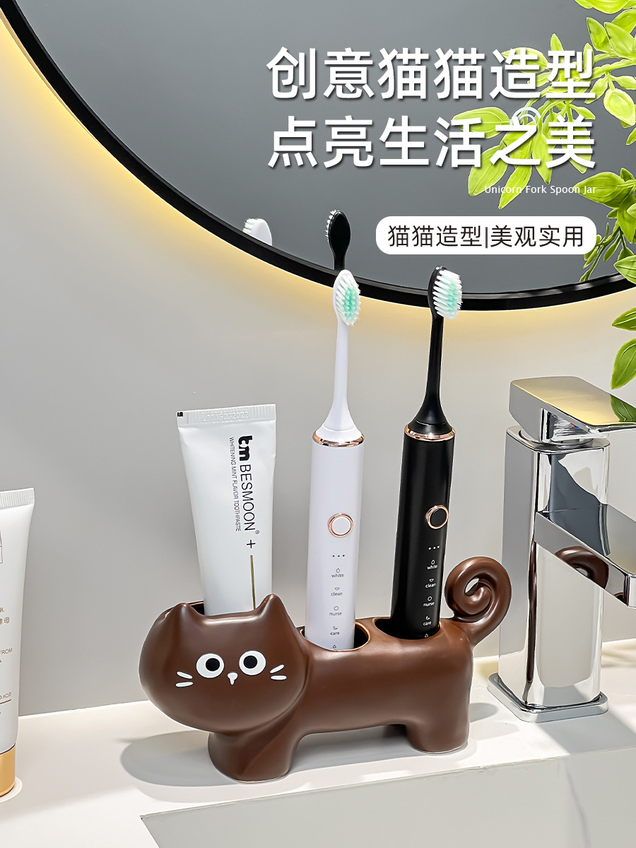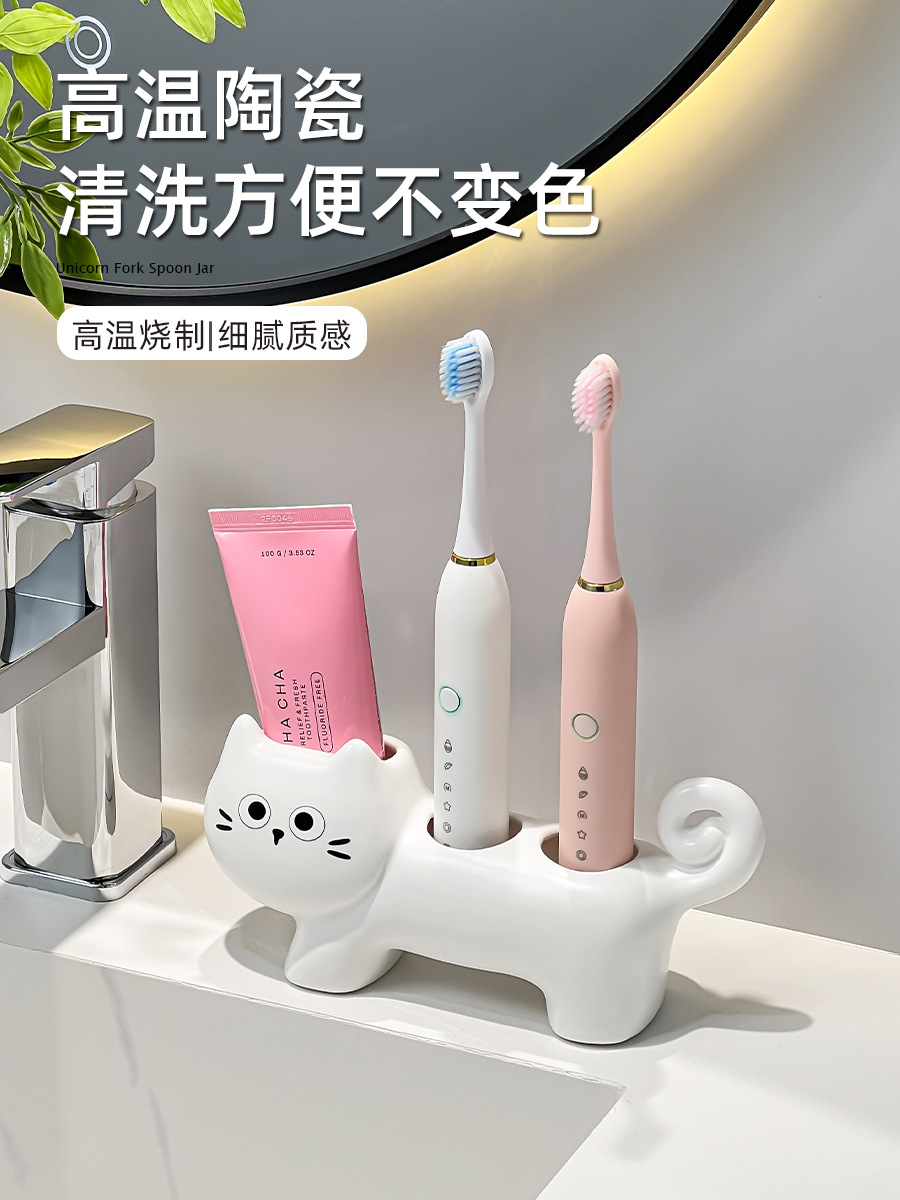 趴趴猫陶瓷电动牙刷架子置物架情侣牙膏放置洗漱台面底座支架座托