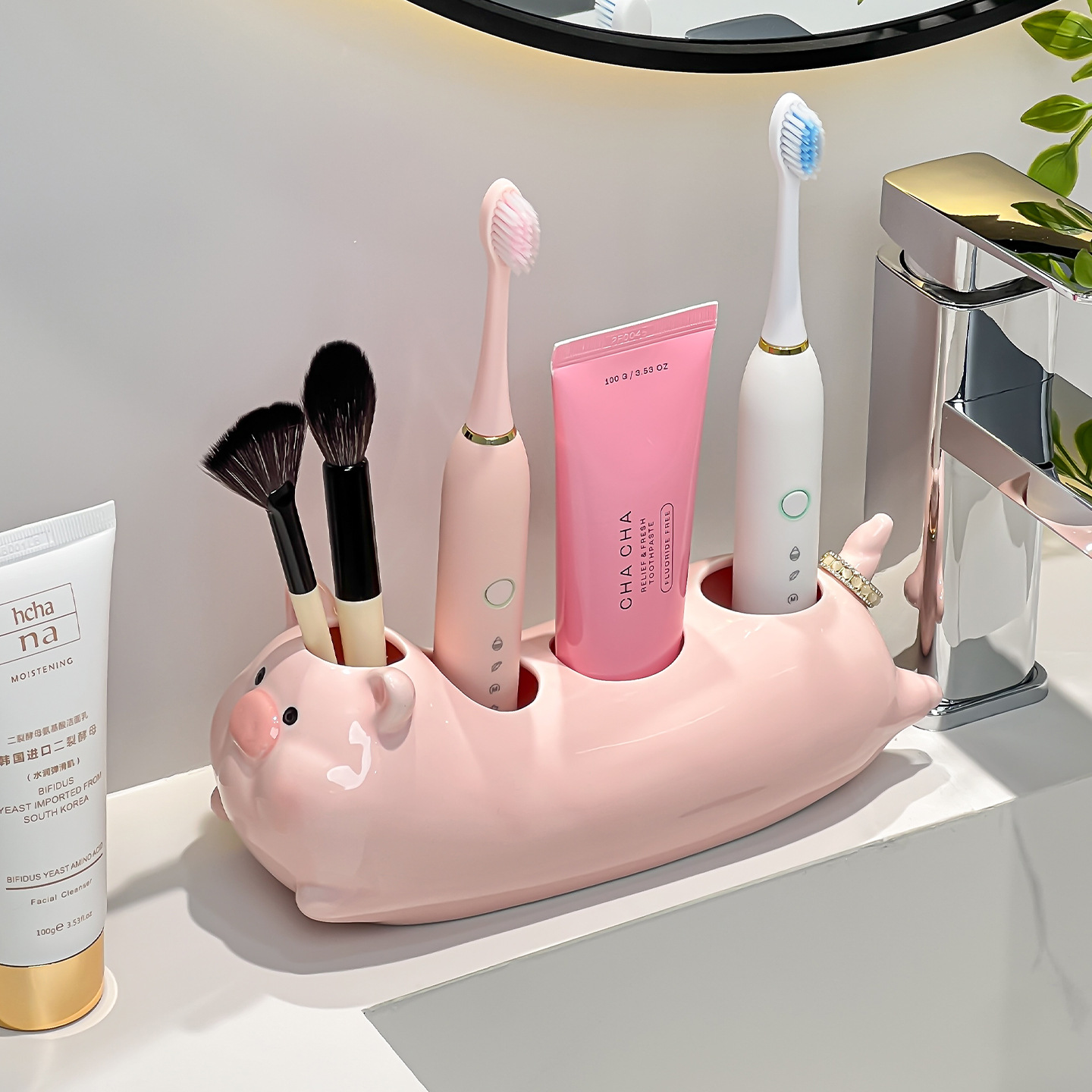 猪猪创意卫生间洗漱台情侣电动牙刷置物架浴室洗手台陶瓷收纳架子