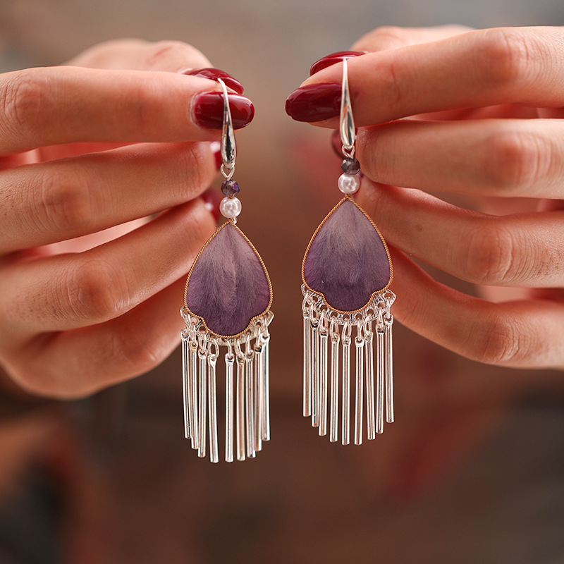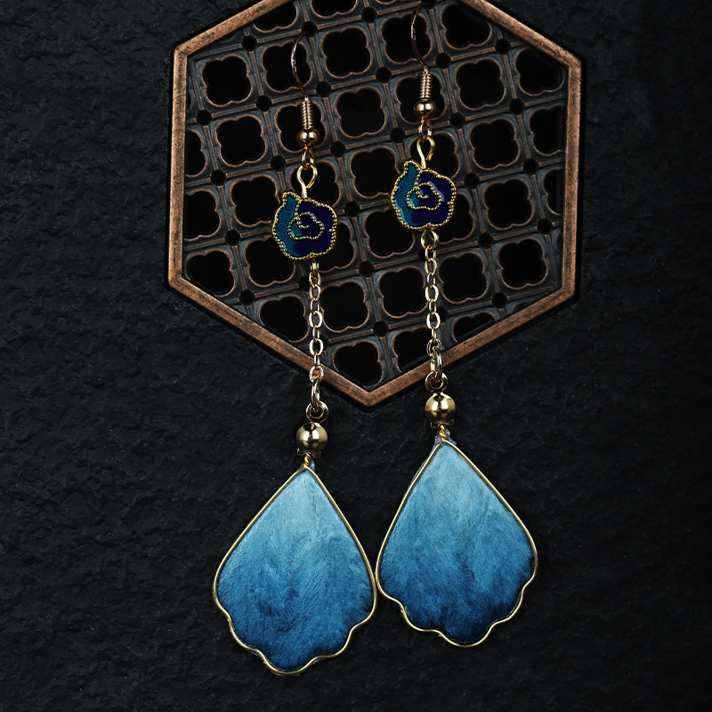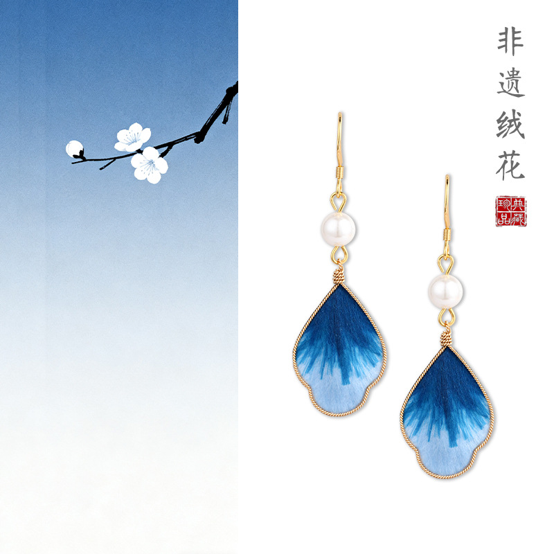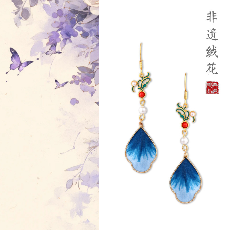 [Bauhinia] 新しい手作り無形文化遺産フィリグリーベルベットフラワーイヤリングレトロチャイナドレスビーズイヤリングニッチブルー